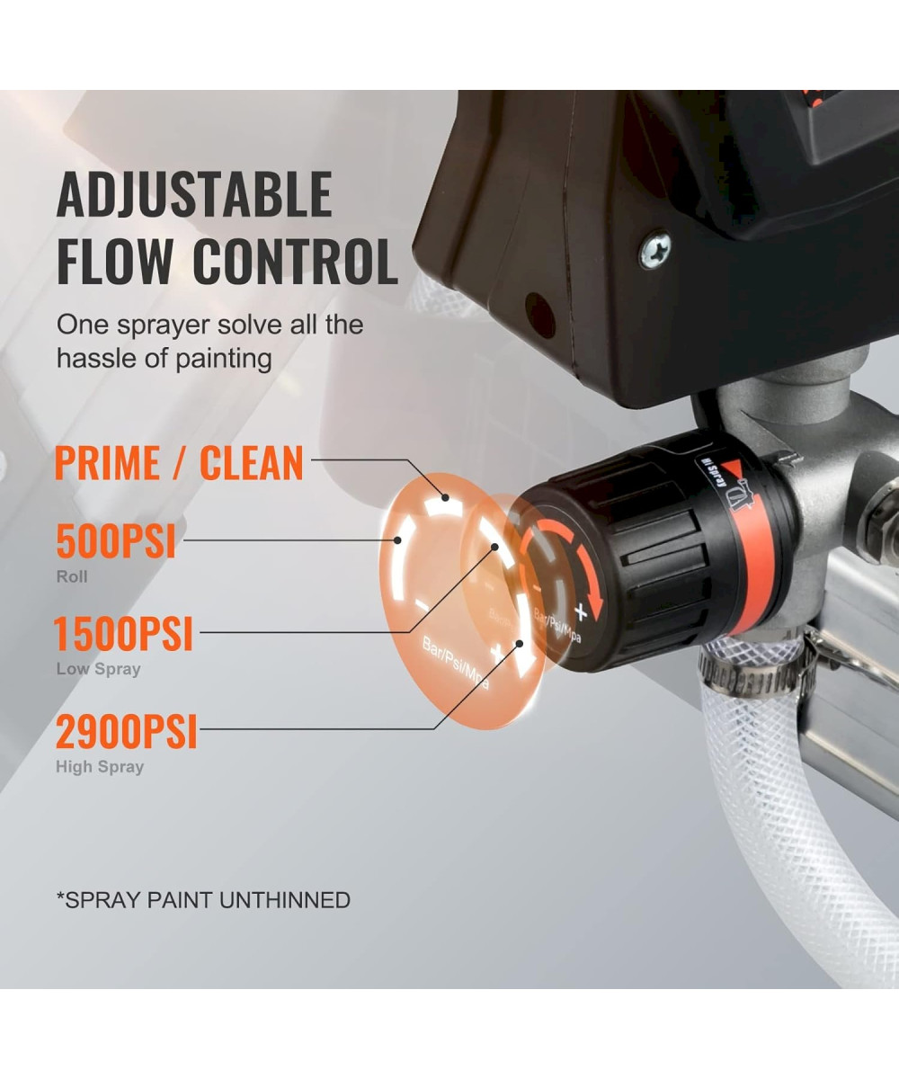 Contrôle de Débit Réglable : La pression de sortie peut être ajustée par un bouton de valve de contrôle pour répondre à vos différents besoins de pulvérisation. Il varie de 500 PSI à 2900 PSI entre plusieurs modes. Il est également capable d'économiser votre argent dépensé en peinture en évitant les déversements de peinture salissants jusqu'à 55 %. La pompe à piston durable peut pulvériser de la peinture non diluée à haute pression, ce qui signifie que les utilisateurs peuvent aspirer la peinture directement à partir de la boucle de peinture. Ne laissez pas la pression vous atteindre. Vous êtes en contrôle !