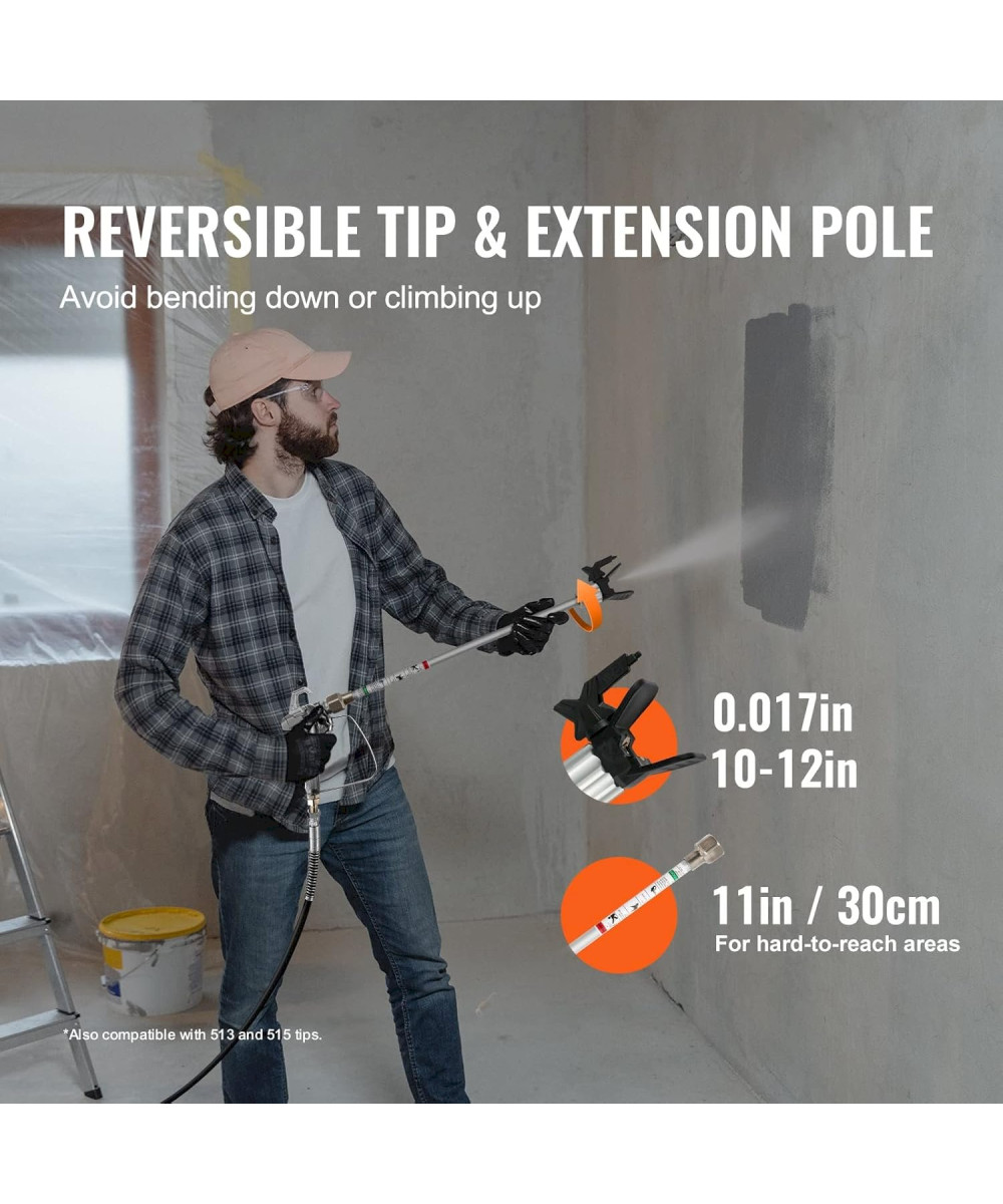 Atteignez Plus Haut Que Jamais : Vous recevrez une pointe 517 et une tige d'extension de pointe de 30 cm. Notre pulvérisateur sans air à support électrique est dédié à l'extension de votre portée et à la réduction de la fatigue lors de la pulvérisation de zones hautes, basses ou encastrées. Les plafonds, les soffites, les hauts murs, les surplombs, les terrasses et autres endroits qui sont juste un peu hors de portée de la peinture au pistolet ne sont plus un défi. Rangez votre échelle et votre équipement d'échafaudage, vous avez compris !