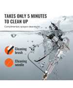 Pas de Peur du Nettoyage : Ce pulvérisateur sans air pour l'intérieur et l'extérieur de la maison est facile à nettoyer après utilisation. Faites simplement couler une solution de nettoyage d'eau ou de solvant dans le pulvérisateur jusqu'à ce que toute la peinture ou les taches soient éliminées. C'est aussi simple que ça ! Nous proposons également un kit de nettoyage permettant aux utilisateurs d'éliminer la poussière pour de meilleurs résultats et de prolonger la durée de vie du pistolet. Êtes-vous prêt à vous attaquer à votre prochain grand projet ?