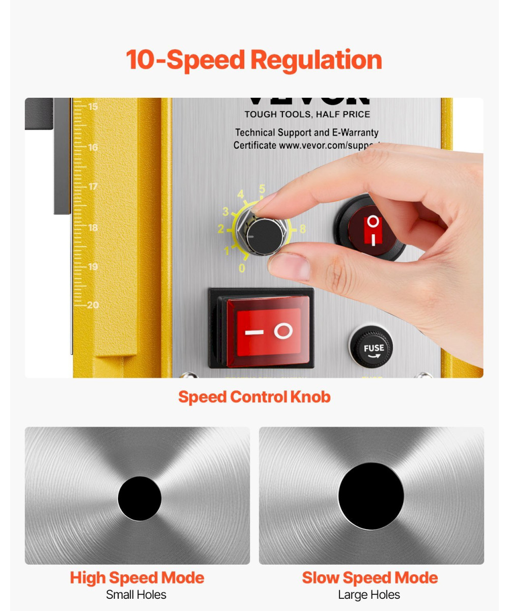 Conception conviviale : une échelle a été ajoutée au cadre de la machine pour aider les utilisateurs à déterminer avec précision la distance entre le foret et le matériau percé en millimètres. Même un novice peut percer des trous précis et nets. De plus, la poignée ergonomique et les 3 manivelles allongées offrent une prise en main confortable lors de la manipulation et du déplacement, ce qui permet d'économiser beaucoup d'efforts