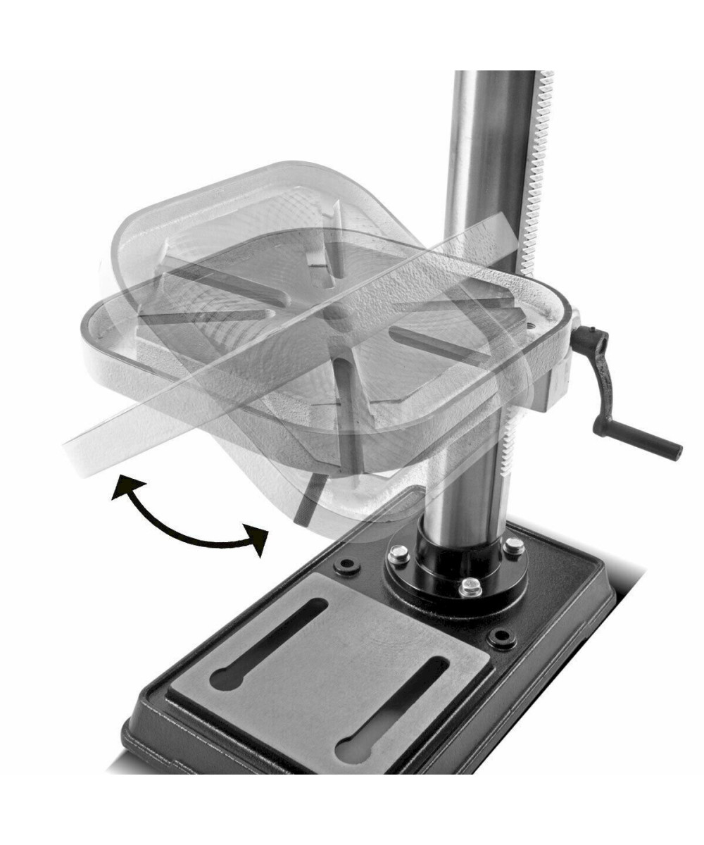 - Table de perçage facilement réglable ou inclinable avec rainures pour trous oblongs.