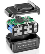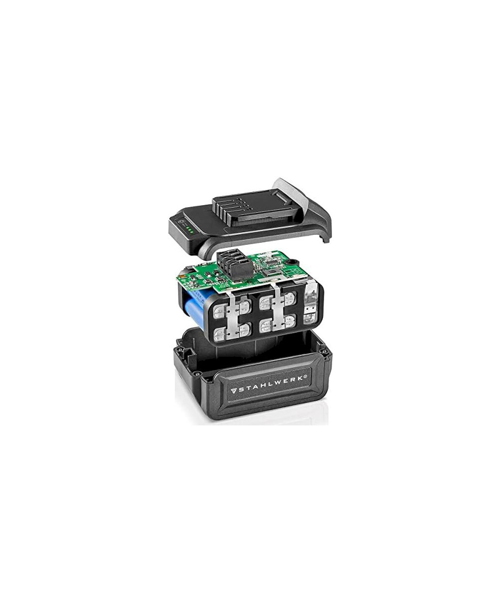 - Le puissant système de batterie Li-Ion 20 V (2 Ah & 4 Ah) est compatible avec tous les outils sans fil STAHLWERK 20V.