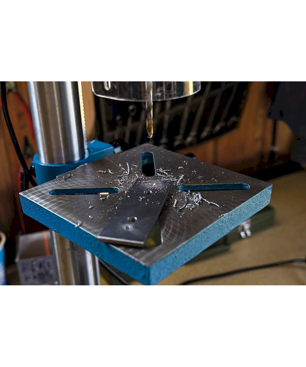 La table de 190 x 190mm a une distance maximale de 350 mm par rapport au mandrin de perçage. Cette distance peut être réduite en continu. De plus, la table de perçage peut être inclinée de 45° des deux côtés. Pour ce faire, il suffit de desserrer la vis à tête hexagonale située sous la table, de régler l'angle souhaité et de resserrer la vis. - Réglage en continu de la vitesse de rotation