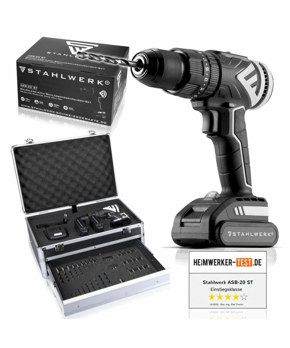STAHLWERK brushless 20 V perceuse visseuse sans fil ASB-20 ST, puissante et sans usure, avec la technologie brushless, poignée ergonomique, incl. 2 Ah batteries et chargeur.