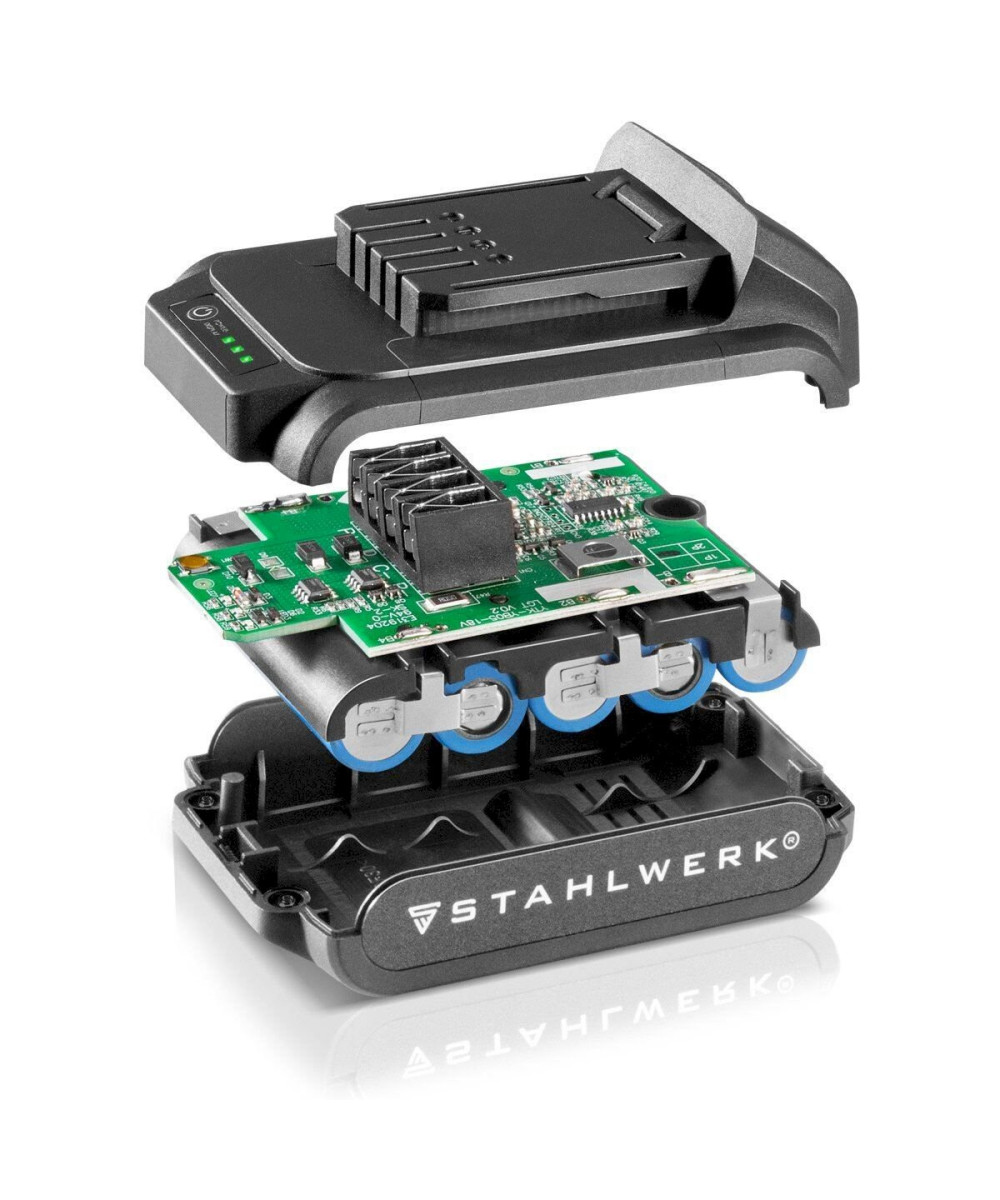 - Le puissant système de batterie Li-Ion 20 V (2 Ah & 4 Ah) est compatible avec tous les outils à batterie 20V de STAHLWERK