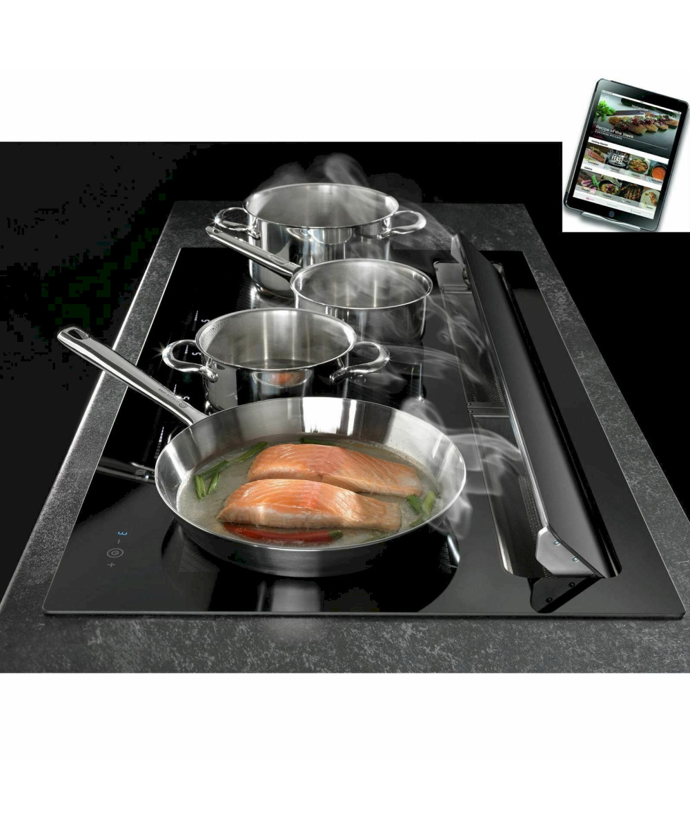 Das induktive 90 cm breite Glaskeramik-Kochfeld mit Flächeninduktion besitzt 4 große Induktionskochzonen und 2 MAXI-Zonen für induktionsgeeignete Bräter, Grillplatten mit intelligenter Topfpositions- und Größenerkennung. Die kompakte autarke Flächeninduktion ist ausgestattet mit einem platzsparenden Umluftmodul mit Entlüfter und integrierter Absaugleiste, wird per Touch-Control-Steuerung bedient und das verbaute Modul macht durch seine flache kompakte Bauweise große Schubladenauszüge für Kochgeschirr und Besteck möglich. Das effiziente geräuscharme 4-stufige Umluft-Modul mit flächenbündiger klappbarer Luft-Absaugklappe und Nachlaufautomatik dient als konventioneller Dunstabzug, führt ungewollte Gerüche, Feuchtigkeit und ungewünschte Aromen vom Kochfeld ab bevor sie sich in der Küche festsetzen können und hinterlässt einen neutralisierten Küchen-Arbeitsplatz selbst bei der Zubereitung von Fisch.