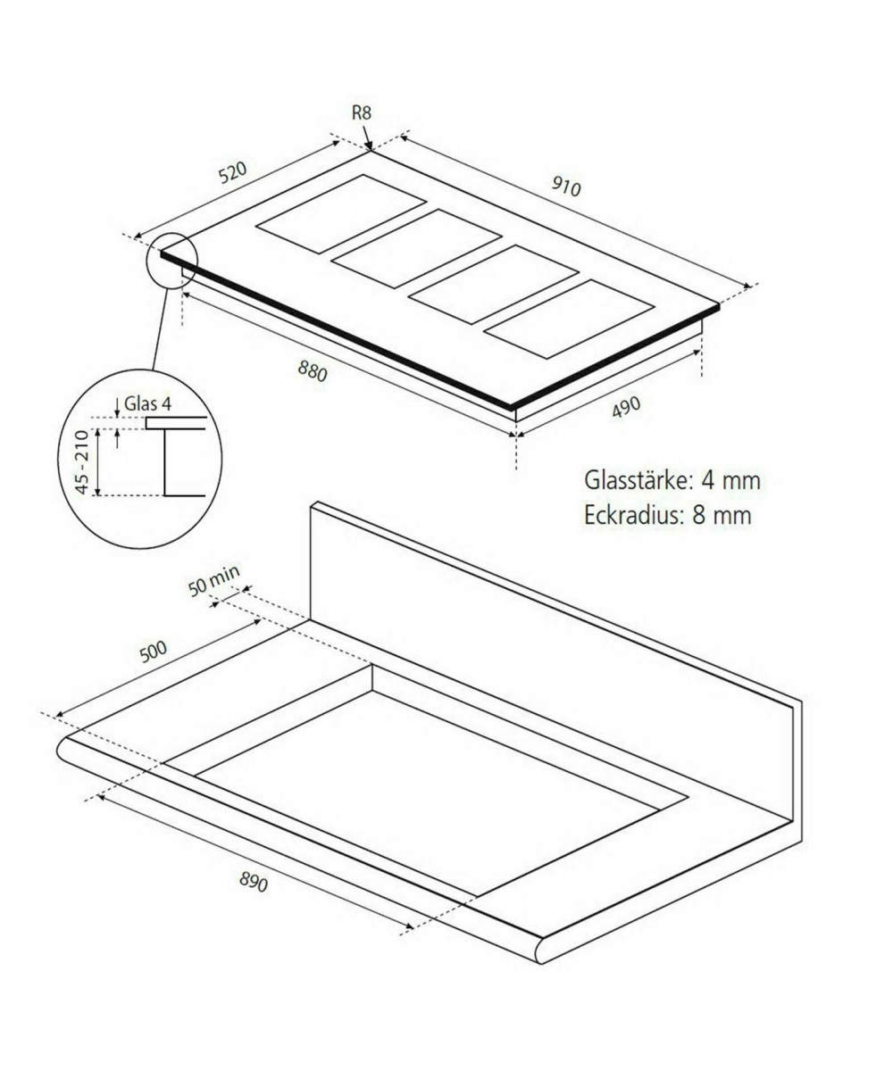Die keramische Glas-Induktionskochfläche kann flächenbündig und rahmenlos in die Arbeitsplatte integriert, auf die Arbeitsplatte aufgelegt oder optional mit grau-silbernen Seitenleisten aus Edelstahl aufgelegt verbaut werden, so können Sie das Kochfeld optisch von der Arbeitsplatte abheben.
