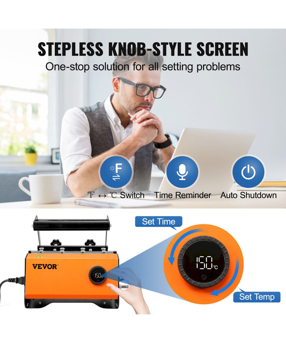 Contrôle Innovant par Bouton : Préparez-vous à presser comme jamais ! Le panneau LCD breveté d'une seule pièce, de type bouton, permet un contrôle précis et sans effort. Tournez-le vers la droite pour régler la température et vers la gauche pour régler l'heure. La machine émet une alarme pour vous rappeler que la sublimation est terminée, ce qui facilite grandement votre travail. Chez VEVOR, nous innovons chaque jour pour vous créer des machines toujours plus innovantes.