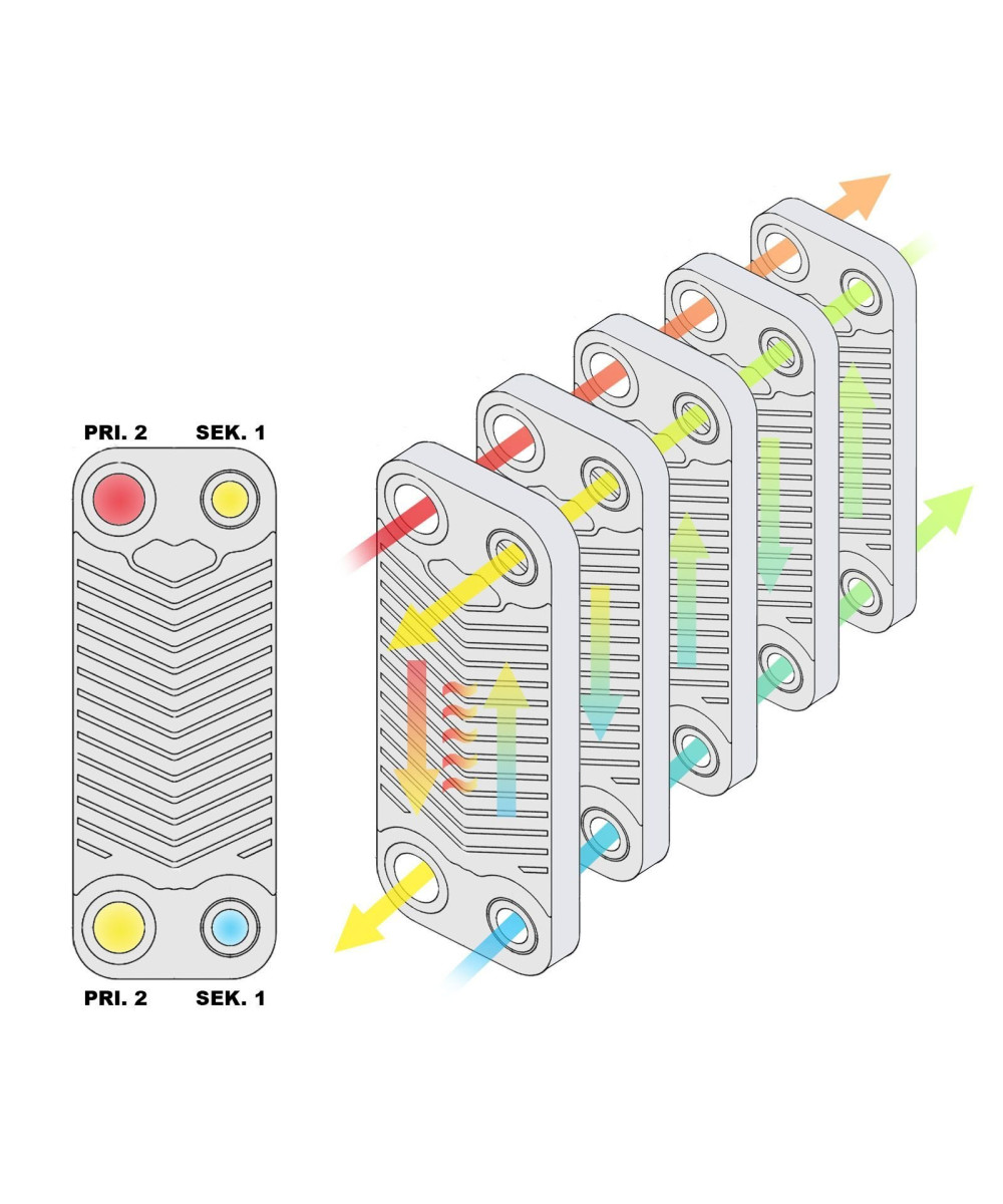 Les HRALE échangeurs de chaleur inox B3-32-30 soudés se composent de plaques inox imprimées qui sont brasées sous vide au cuivre. En les assemblant, une plaque sur deux est tournée à 180 degrés ce qui permet de créer deux espaces en sens contraire l'un de l'autre, dans lesquels les fluides passent en contre-courant. La surface imprimée ondulée des plaques produit un flux turbulent ce qui entraîne une transmission effective de la chaleur même à des volumes très faibles de flux.