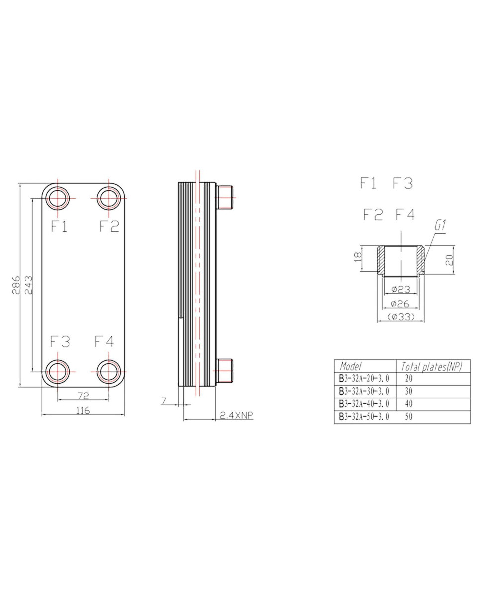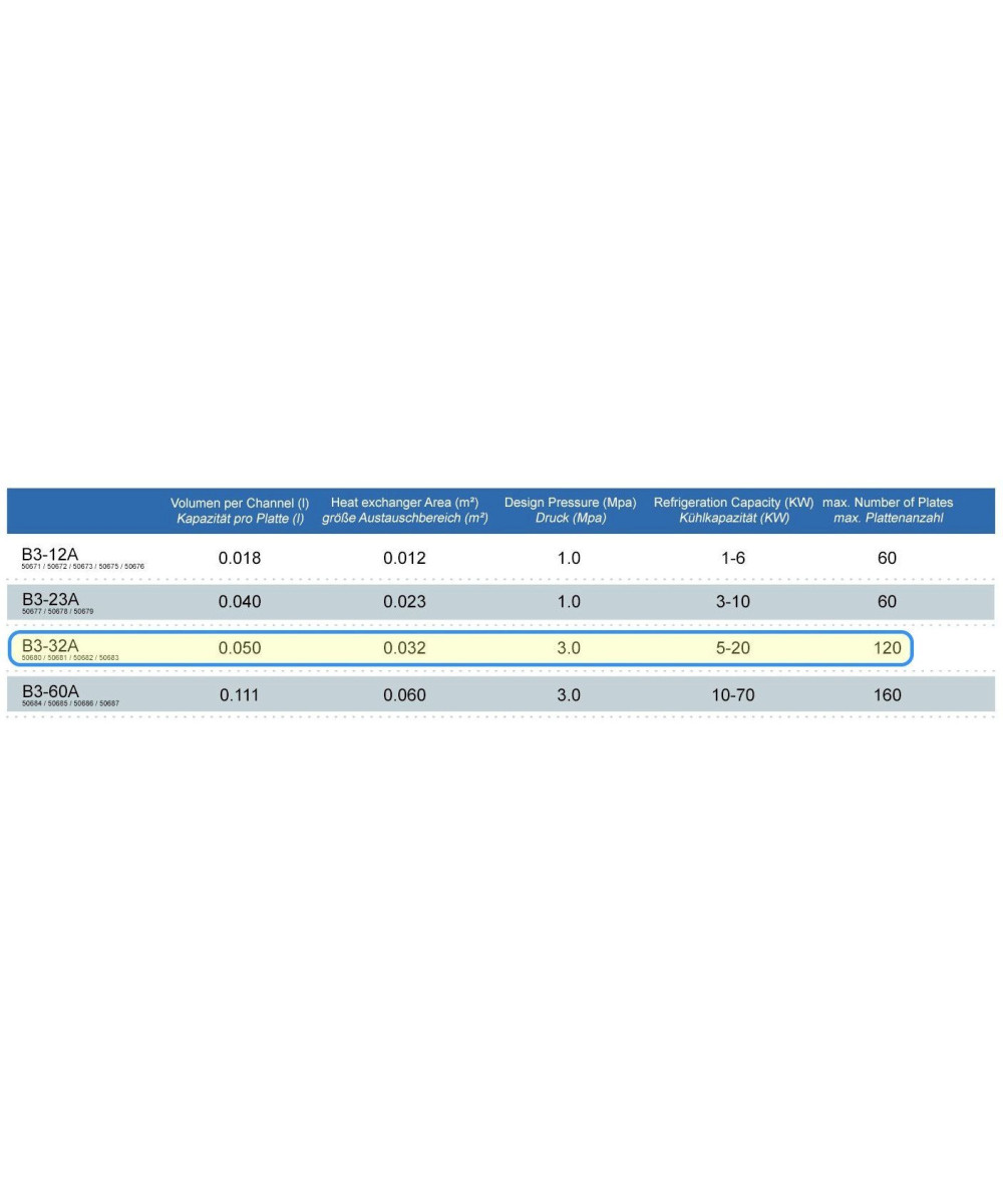 Échangeur de chaleur à plaques inox B3-32-30 avec raccords 4x1 pouce, max. 175 kW