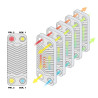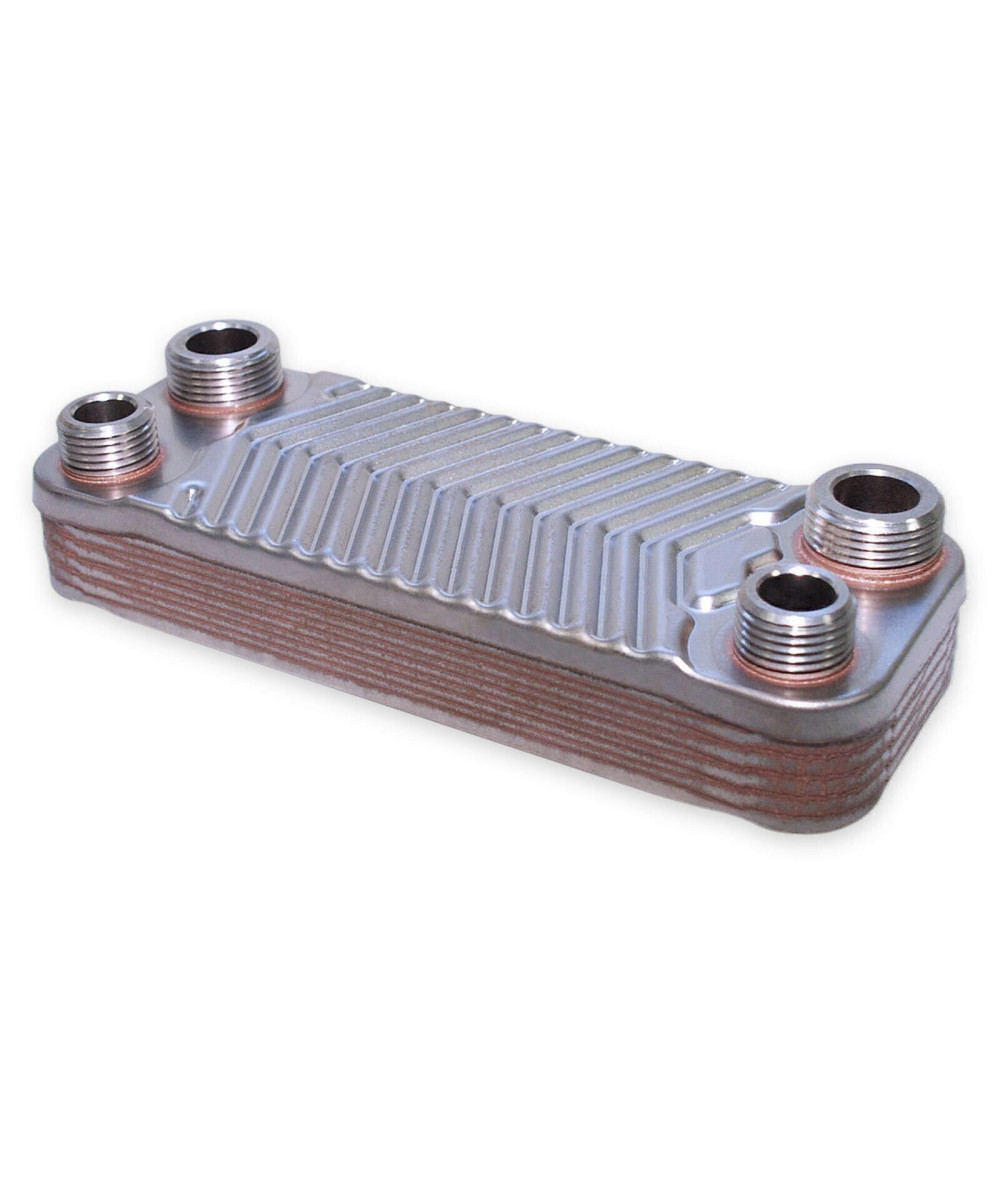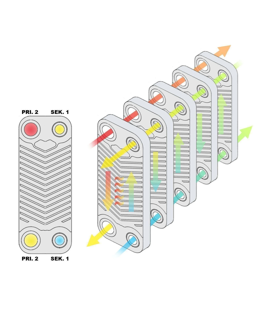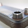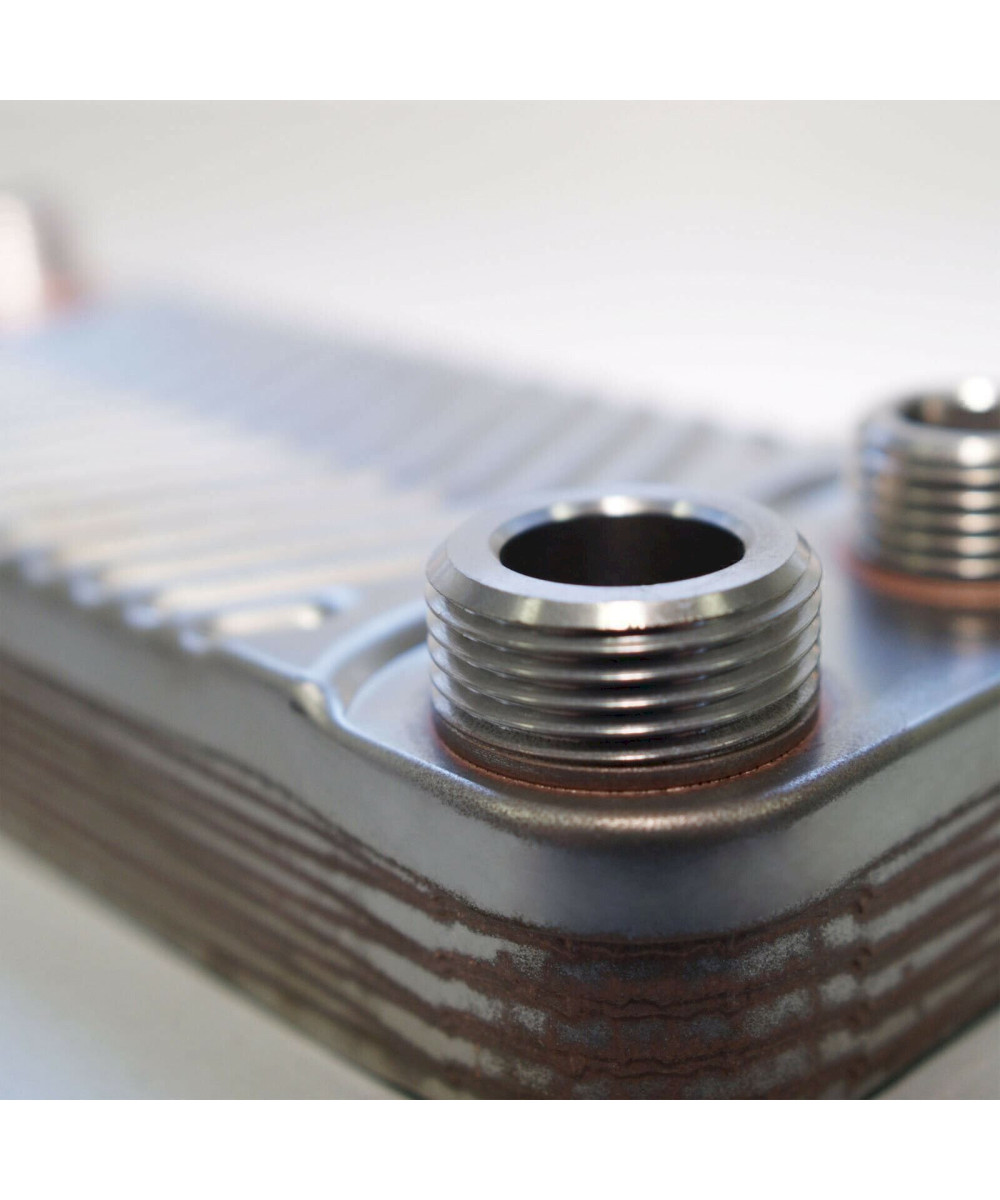 Les HRALE échangeurs de chaleur inox B3-12-10 soudés se composent de plaques inox imprimées qui sont brasées sous vide au cuivre. En les assemblant, une plaque sur deux est tournée à 180 degrés ce qui permet de créer deux espaces en sens contraire l'un de l'autre, dans lesquels les fluides passent en contre-courant. La surface imprimée ondulée des plaques produit un flux turbulent ce qui entraîne une transmission effective de la chaleur même à des volumes très faibles de flux.