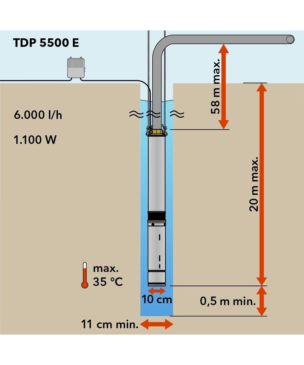 Le corps de la pompe est réalisé en acier inoxydable. Il offre une grande robustesse et renferme le moteur en cuivre sans entretien. Les finitions soignées garantissent une grande durée de vie du produit pour un fonctionnement immergé sans panne. Utilisable toute l'année, la pompe TDP 5500 E est dotée d'un filtre en inox stoppant les particules de 0,2 mm min., d'une valve anti-retour ainsi que d'une protection thermique.