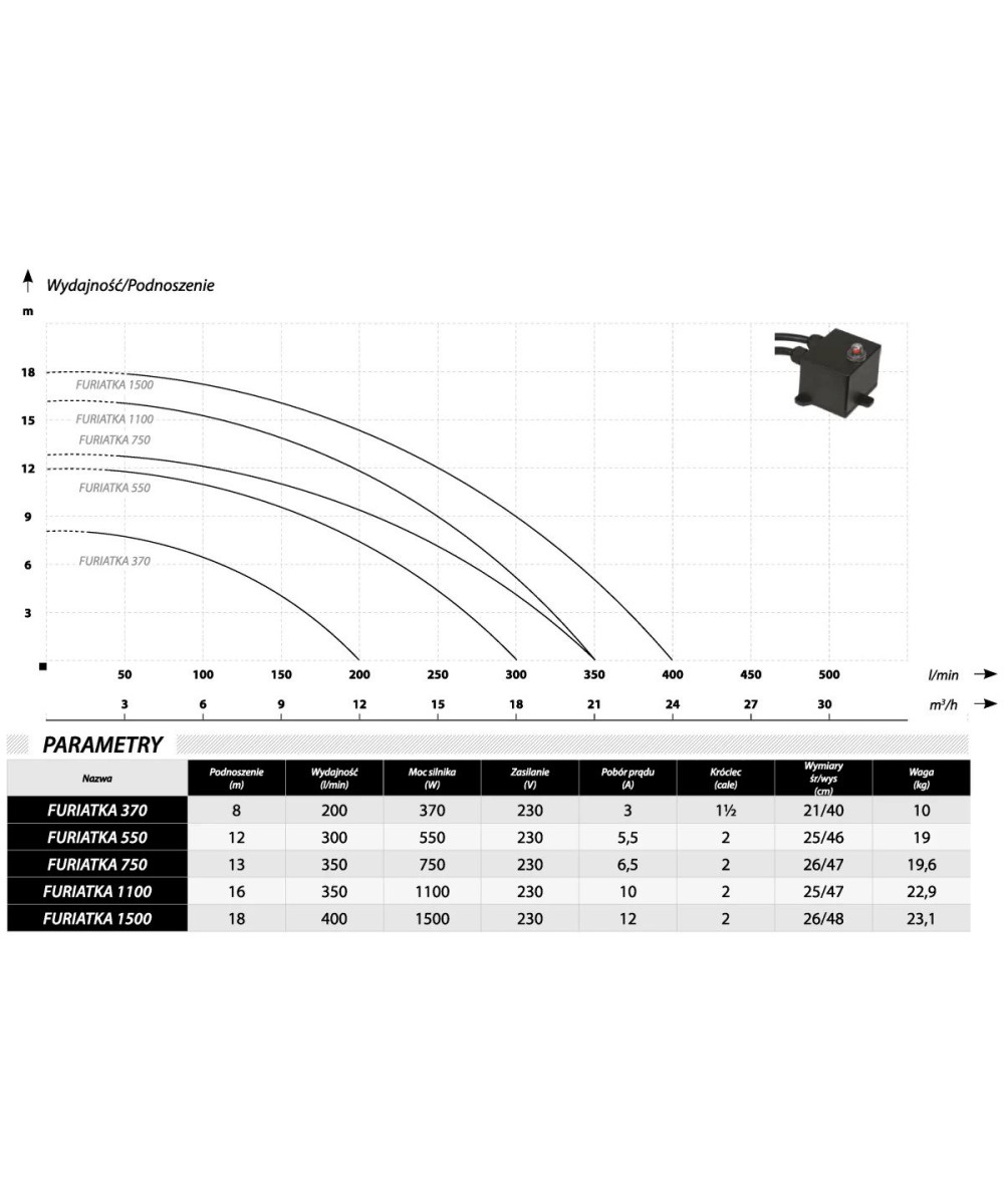 Eine Tauchpumpe aus robustem Gusseisen – die Furiatka 550 – eignet sich zum Pumpen von häuslichem Abwasser und zur Entwässerung von überfluteten Räumen. Die Pumpe ist mit einem Zerkleinerungssystem ausgestattet, welches das Risiko einer Verstopfung minimiert. Da die Furiatka 550 mit einem Überlastungsschutz versehen ist, garantiert die Pumpe einen störungsfreien Betrieb. Auch gegenüber mechanischen Beschädigungen und chemischen Korrosion ist die Pumpe aufgrund des hochwertigen Gusseisens widerstandsfähig. Durch einen integrierten Schwimmerschalter wird der Betrieb der Pumpe automatisch gesteuert. Sowohl ein Druckschlauch mit einem Band als auch mit einer Schnellkupplung kann an die Pumpe angeschlossen werden.