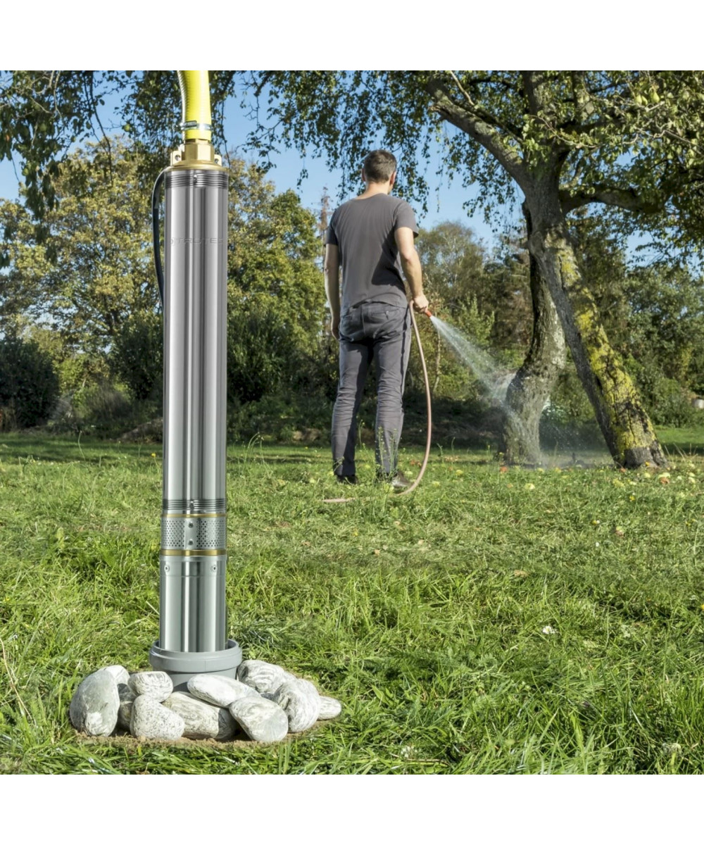 La pompe de forage TDP 7500 E est la solution idéale pour arroser le jardin en été à moindres coûts. Grâce à cette pompe pouvant puiser de l'eau à des profondeurs importantes, vous pourrez arroser plantes et gazon en la raccordant à un tuyau ou à un système d'arrosage automatique. La pression est toujours élevée et peut être utilisée pour alimenter plusieurs installations en parallèle – au jardin comme à la maison. L'utilisation d'eau douce au niveau des installations domestiques permet en effet de réduire sensiblement la facture d'eau. Pensez au nombre de litres d'eau potable que consomme le lave-linge ou la chasse des toilettes. En remplaçant l'eau potable par de l'eau douce, vous réaliserez de réelles économies.