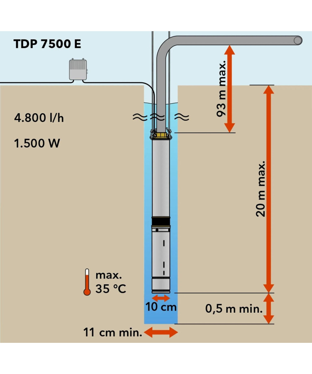 Grâce à une pression de 9,3 bars max., une hauteur de refoulement max. de 93 mètres et une profondeur d'immersion max. de 20 mètres, la pompe TDP 7500 E est idéale pour puiser de l'eau claire de puits, forages et autres points d'eau de grande profondeur. Son faible diamètre de 100 mm permet de l'employer pour des forages d'un diamètre min. de 110 mm.