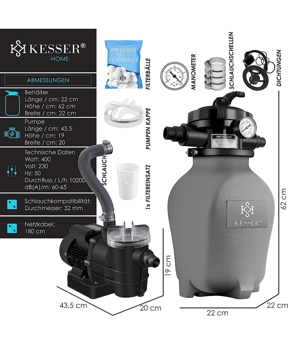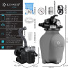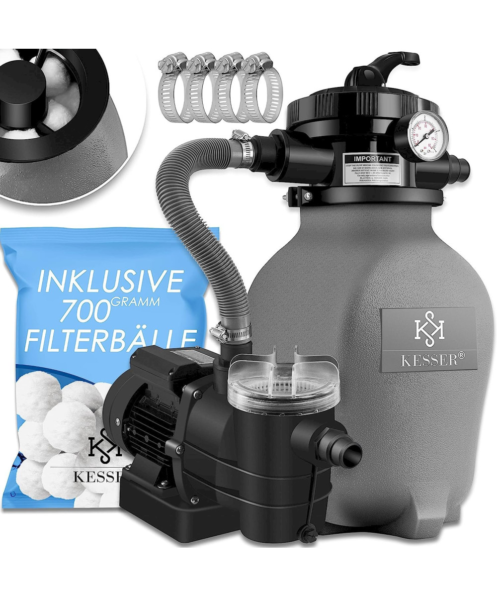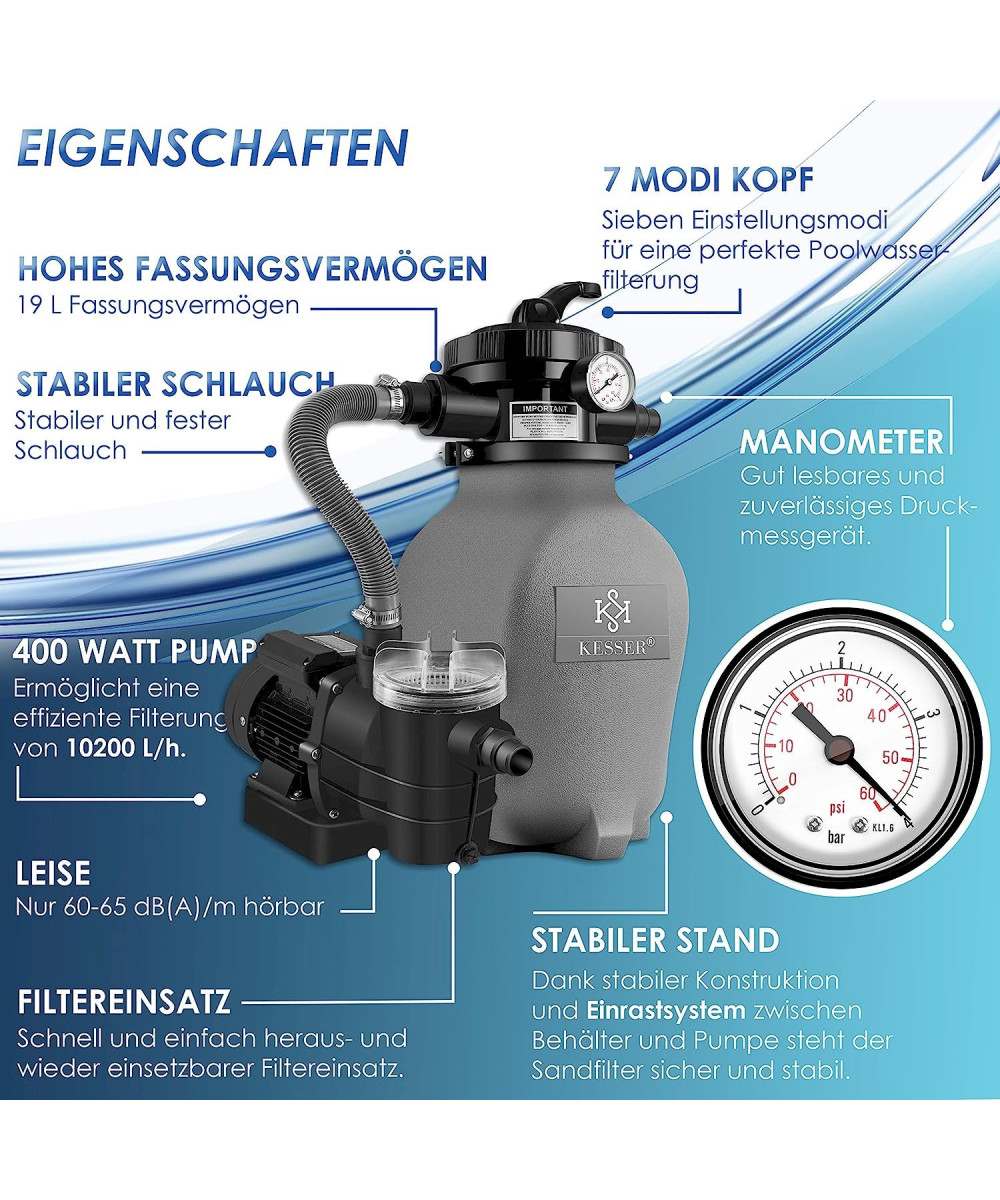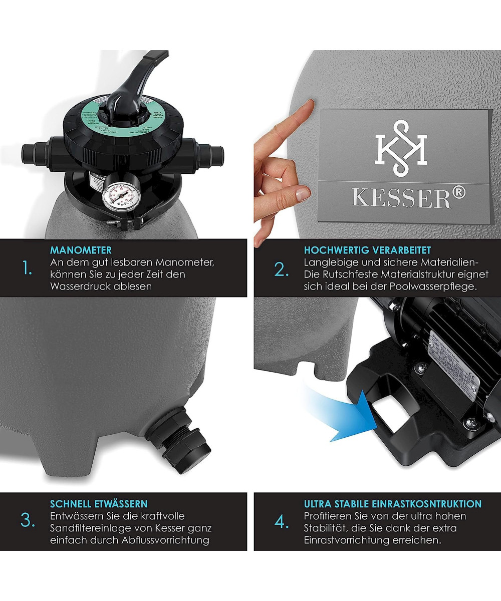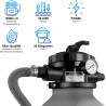 Des caractéristiques supplémentaires font de notre filtre de piscine un leader du marché qui se distingue des autres stations d'épuration. Le manomètre bien lisible vous permet de lire à tout moment la pression de l'eau. Des matériaux robustes et sûrs, comme le tuyau intégré, vous garantissent une installation de filtration de piscine durable. De plus, la structure antidérapante du matériau convient en outre à l'entretien idéal de l'eau de la piscine.
