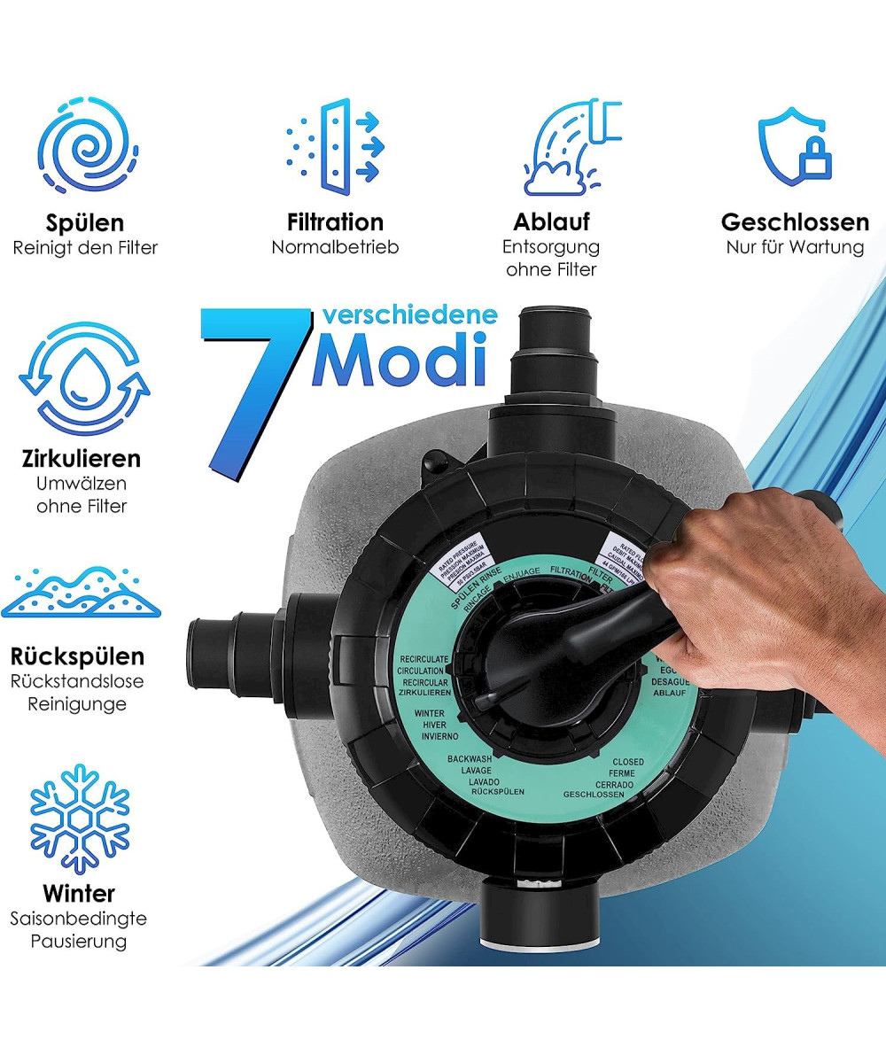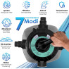- Possibilités de réglage : 7 (rinçage, filtration, écoulement, fermé, rétrolavage, hiver, circulation)