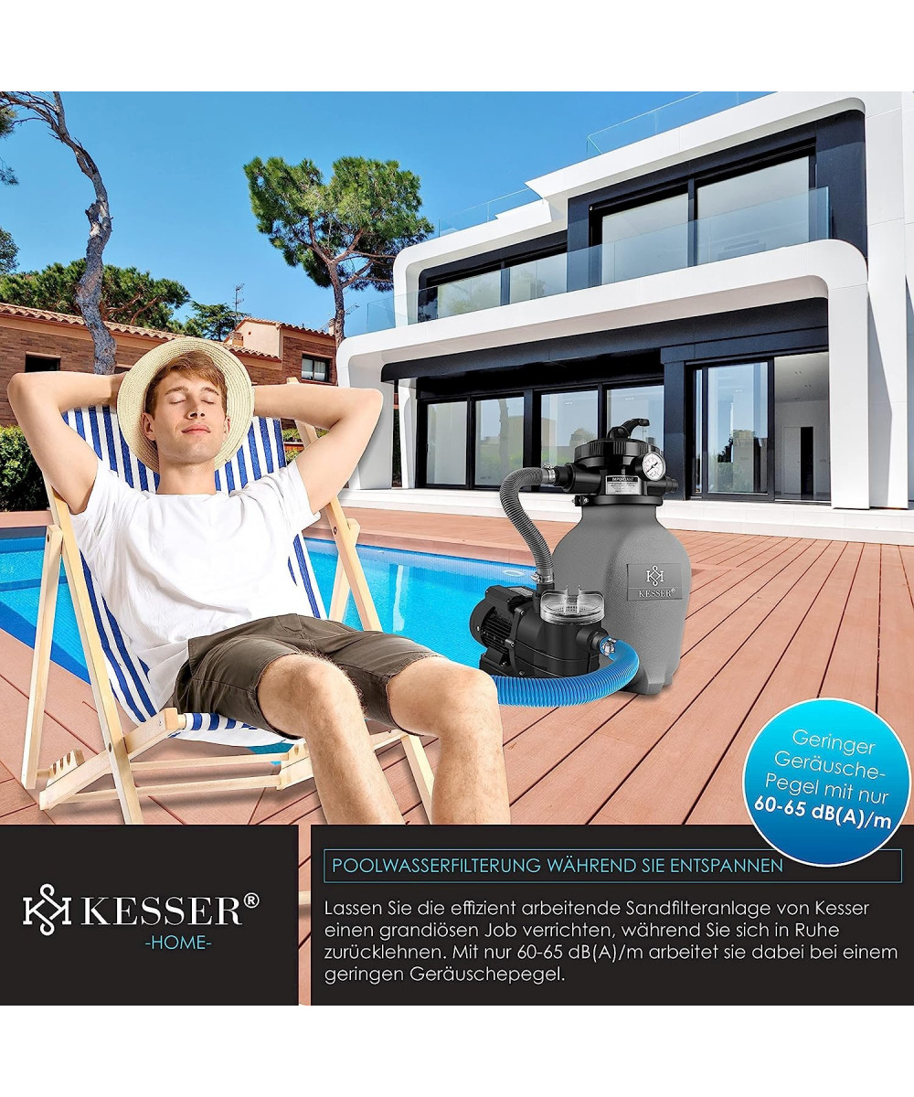 Laissez le système de filtration à sable efficace faire un travail incroyable pendant que vous vous détendez tranquillement. Avec seulement 60-65 dB(A)/m, les installations de filtration fonctionnent à un niveau sonore très faible. Profitez d’une filtration professionnelle de l’eau de votre piscine avec ce puissant système de filtration à sable