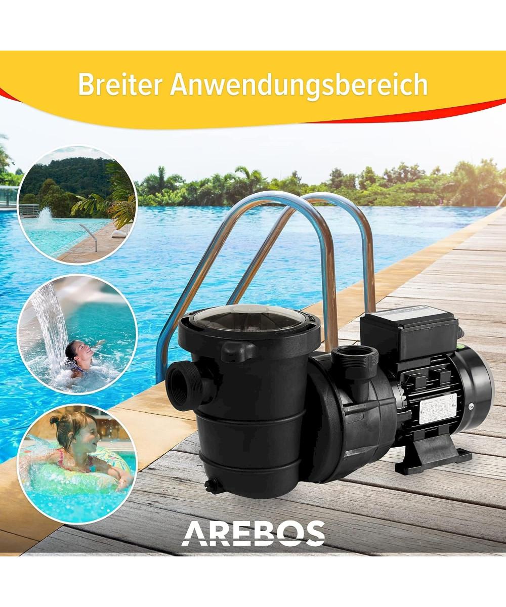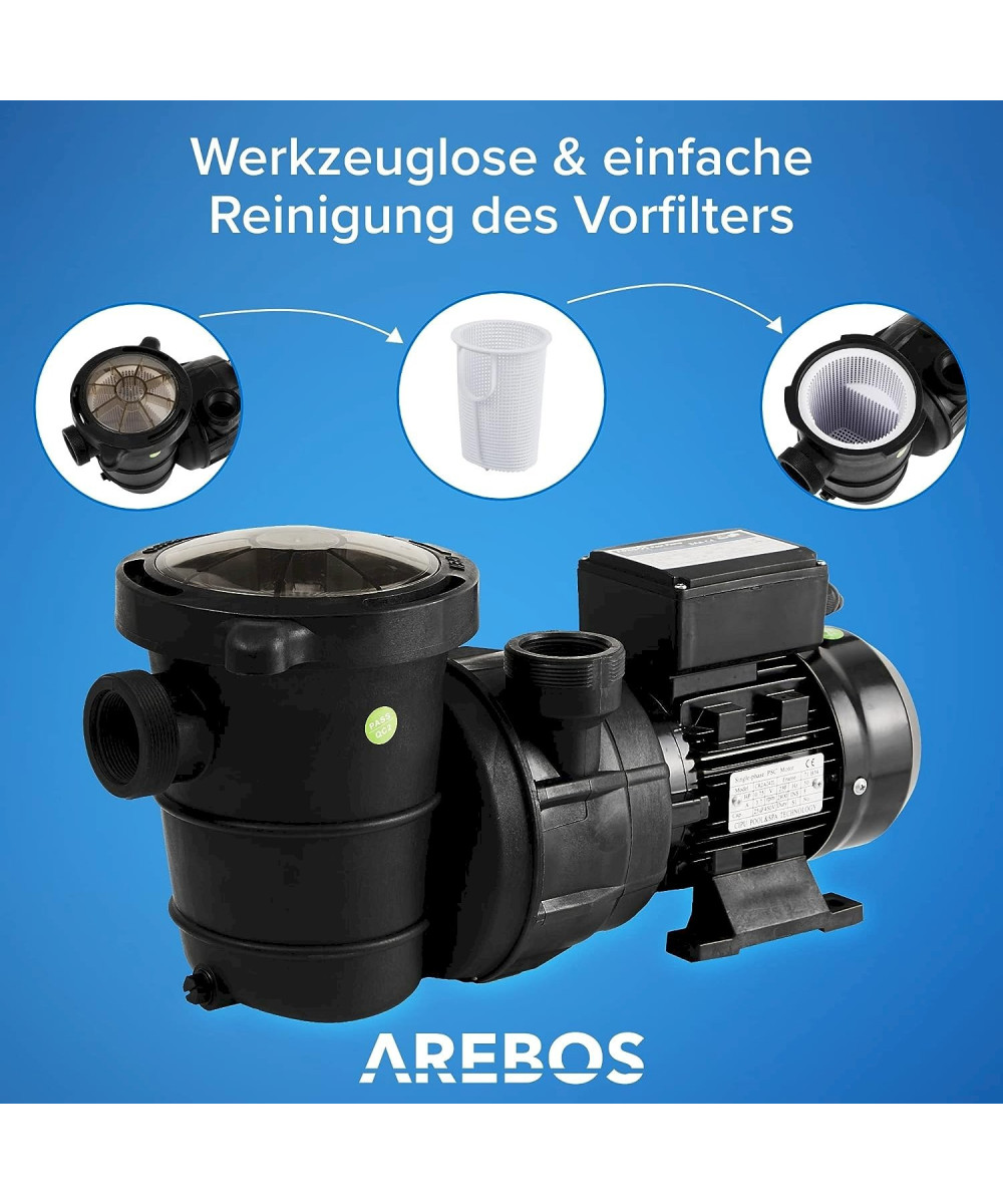 La pompe de piscine d’AREBOS vous permet de profiter de l'eau pure. Un bon nettoyage de la piscine est crucial afin de garder la piscine exempte de germes et de bactéries. Cette pompe de piscine de haute qualité d'AREBOS élimine rapidement et de manière fiable les impuretés visibles dans l'eau. Il convient au raccordement à une unité de filtration.