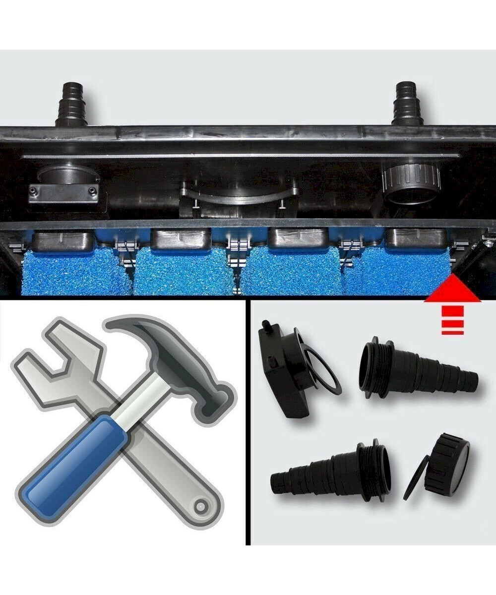 Ceci est valable aussi pour le raccord au filtre de bassin des unités de stérilisateurs de bassins plus petits. Le raccord de la pompe de bassin se fait par un tuyau de bassin , le clarificateur peut alors être placé ou vissé à distance au filtre de bassin: