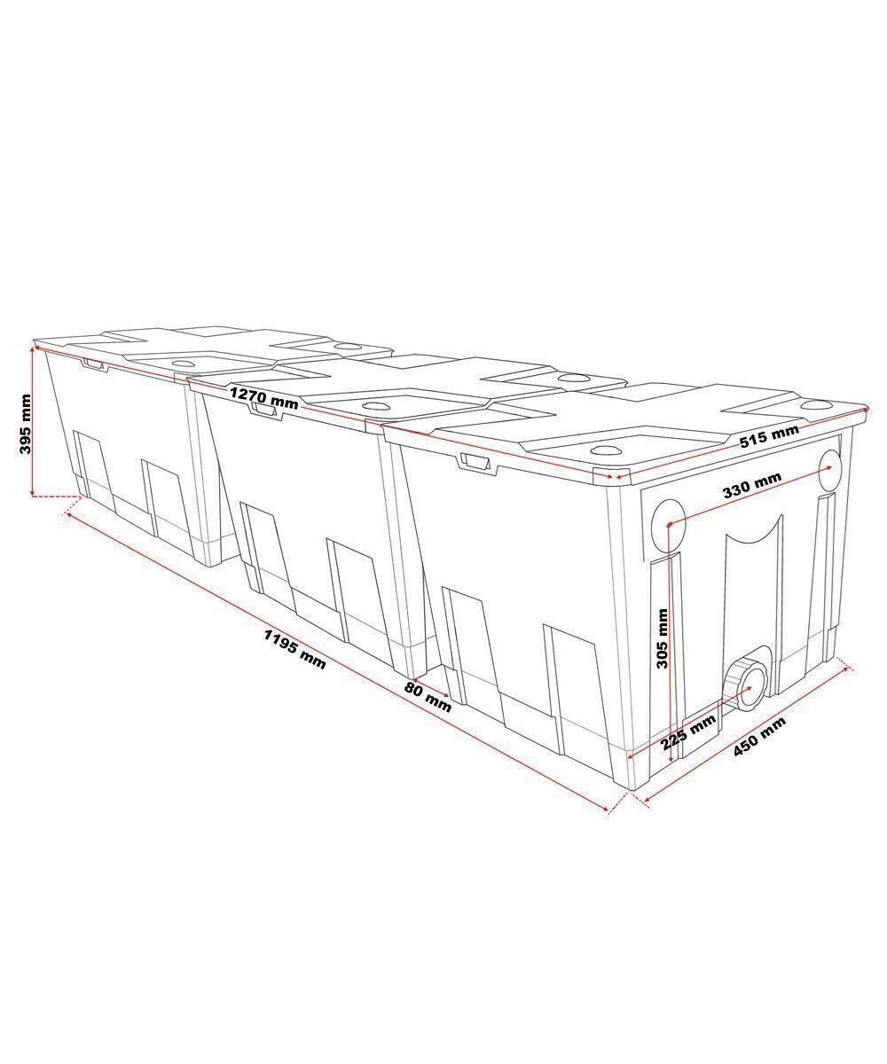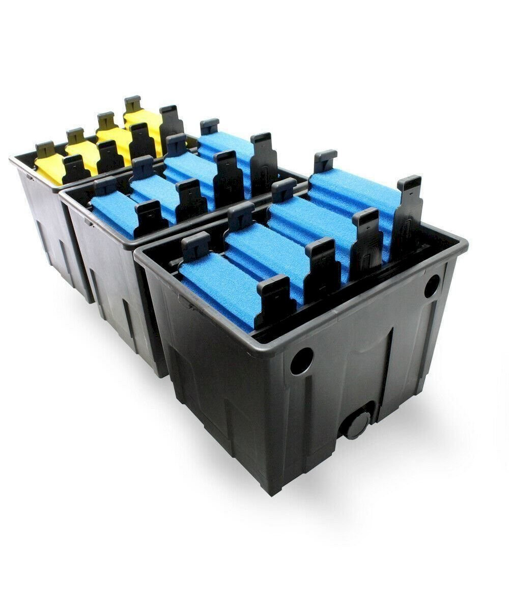 Avec un volume de filtration d'env. 180 litres, qui se répartit sur 3 chambres, le filtre de bassin assure le filtrage et nettoyage de façon fiable et avec un minimum d'efforts, des grands bassins de Koï. Le filtre est livré avec 8 éponges filtrantes grossières, 4 éponges filtrantes fines et 3 tapis japonais.