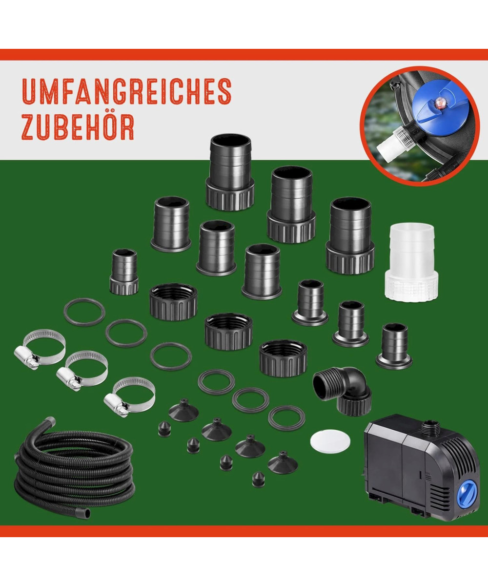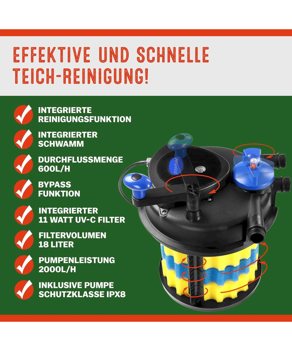 e filtre à pression pour bassin avec pompe assure un équilibre biologique et stable dans le bassin et améliore la qualité de l'eau. Cet effet est obtenu grâce à une combinaison d'éponges filtrantes et de technologie UV-C. L'eau du bassin traverse un module qui lui est exposé au rayonnement UV-C. Les structures tertiaires et quaternaires des protéines d'algues sont donc modifiées. Les algues s'agglutinent pour former des particules plus grosses et peuvent facilement être retirées du cycle d'eau en utilisant une filtration mécanique du bassin.