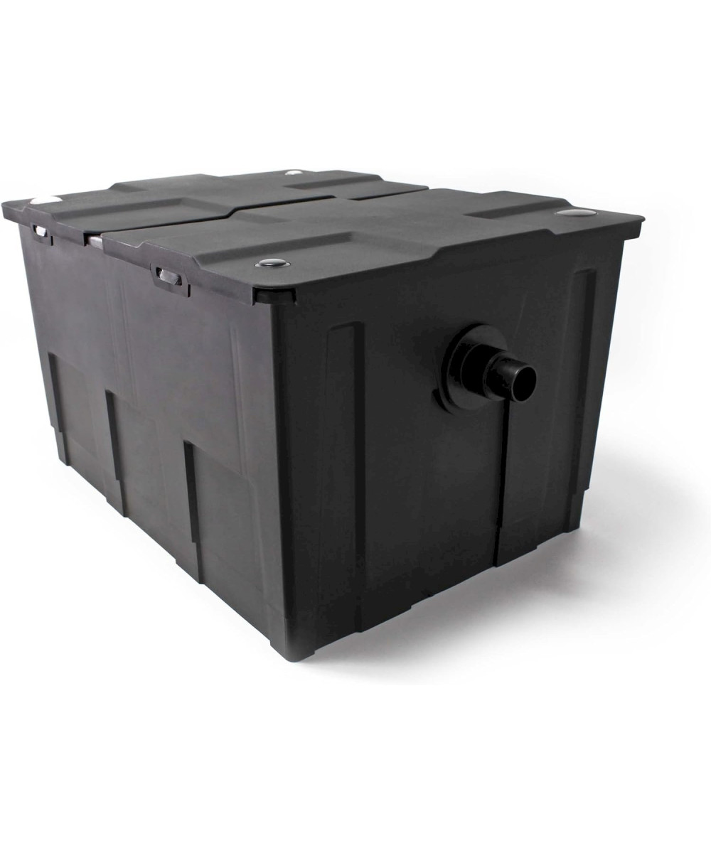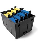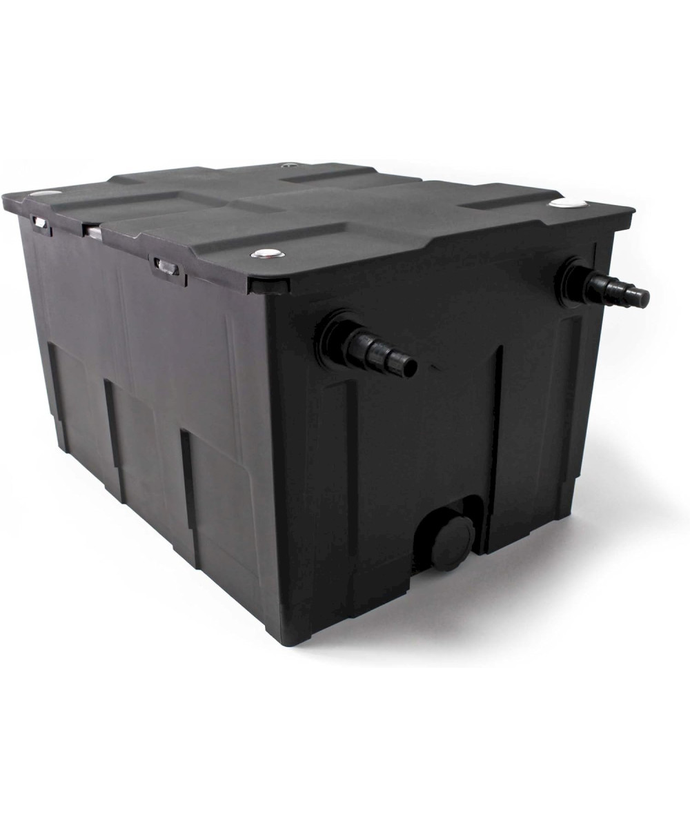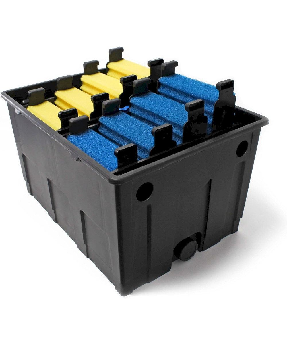 Unser biologischer Modulteichfilter eignet sich für Gartenteiche bis 60000 Liter. Mit einem Filtervolumen von ca. 120 Litern in einer Kammer gewährleistet der Teichfilter eine zuverlässige Reinigung größerer Koiteiche mit minimalem Aufwand. Der Teichfilter ist mit insgesamt 4 groben Filterschwämmen, 4 feinen Filterschwämmen und 2 Japan-Filtermatten bestückt. Die Schlauchstufentüllen haben eine Größe von 20 / 25 / 32 und 40 mm.