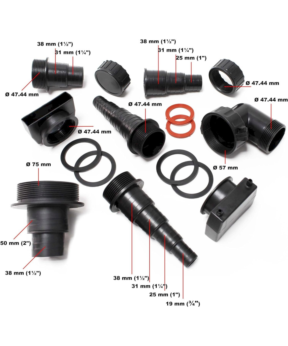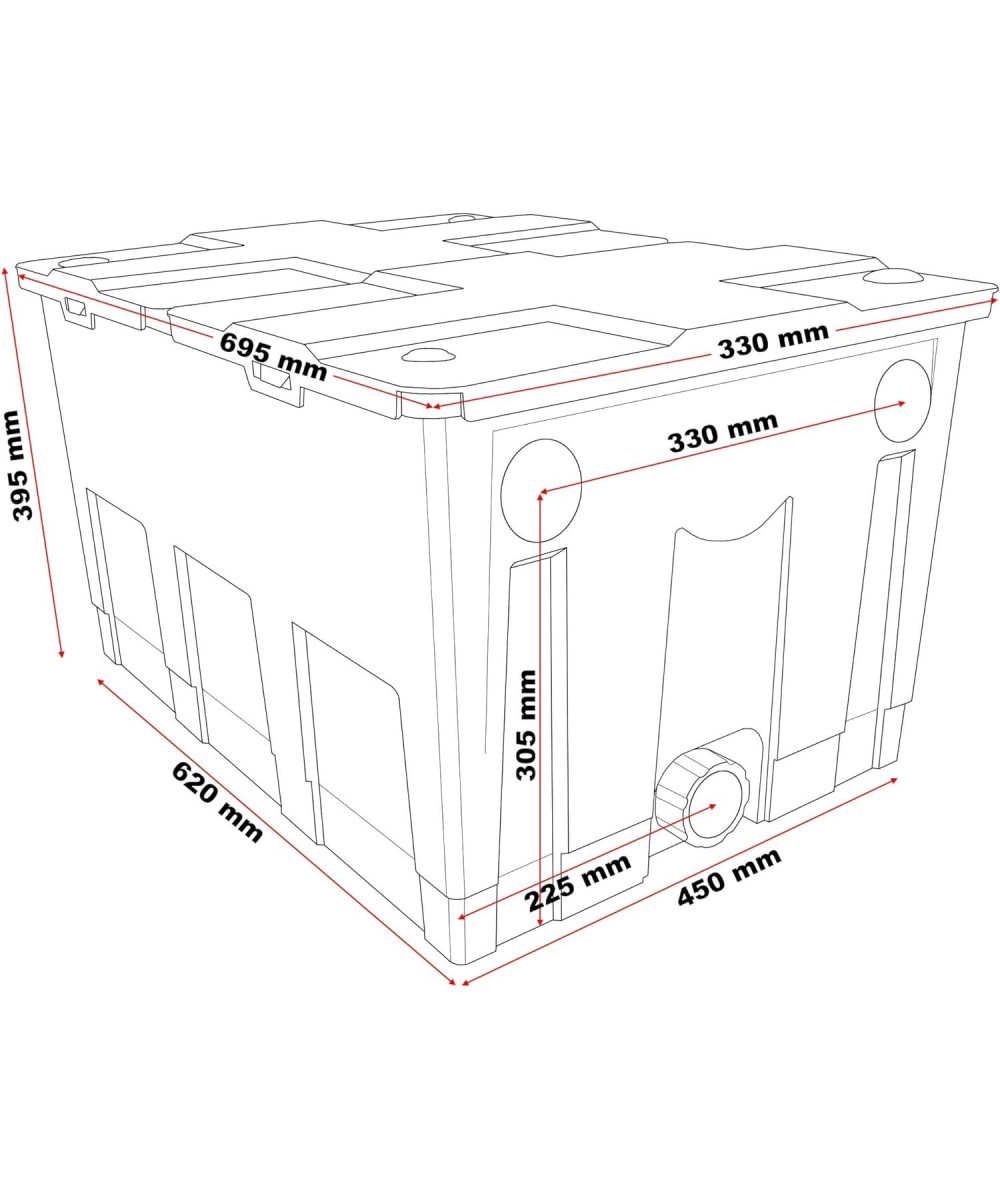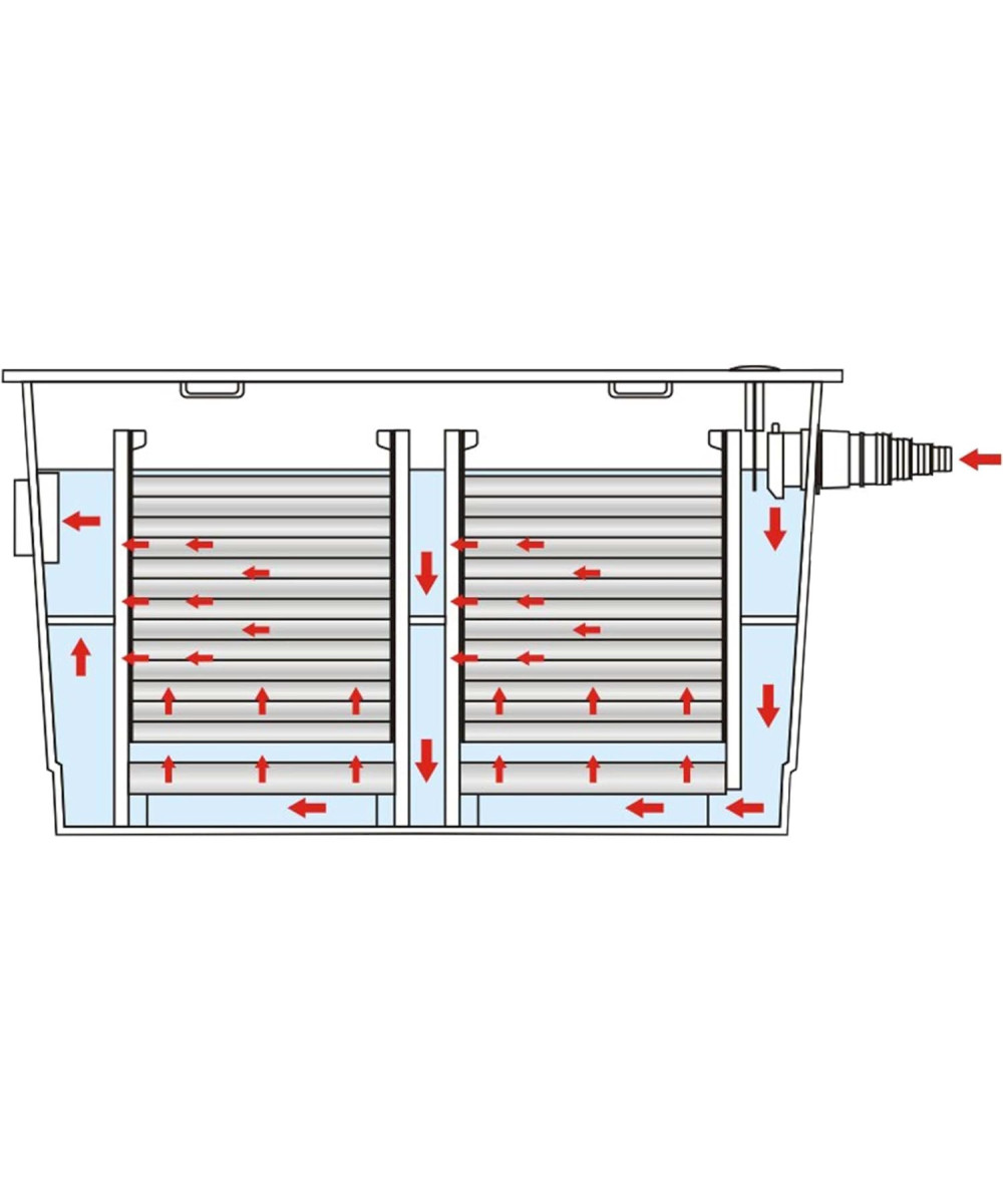 Unser biologischer Modulteichfilter eignet sich für Gartenteiche bis 60000 Liter. Mit einem Filtervolumen von ca. 120 Litern in einer Kammer gewährleistet der Teichfilter eine zuverlässige Reinigung größerer Koiteiche mit minimalem Aufwand. Der Teichfilter ist mit insgesamt 4 groben Filterschwämmen, 4 feinen Filterschwämmen und 2 Japan-Filtermatten bestückt. Die Schlauchstufentüllen haben eine Größe von 20 / 25 / 32 und 40 mm.