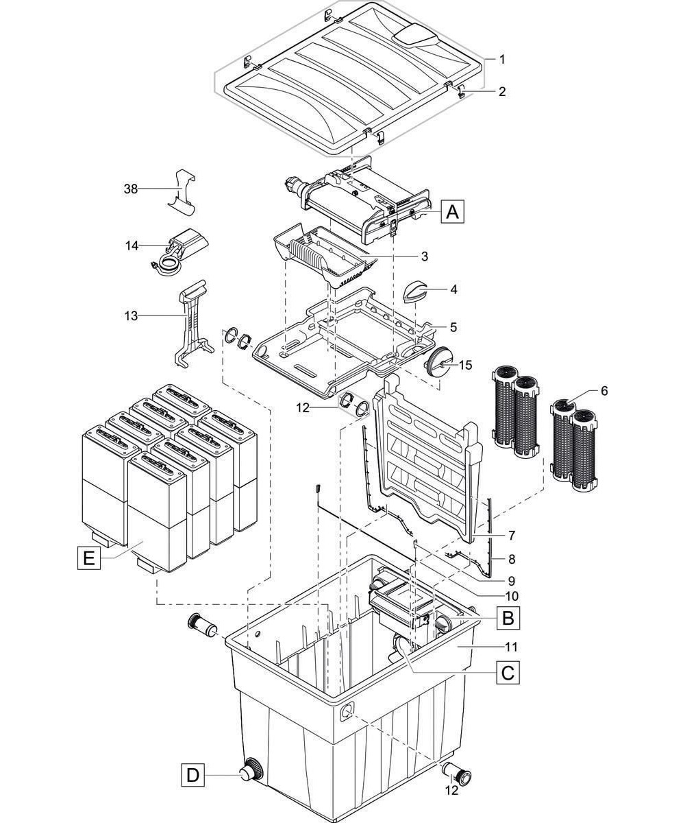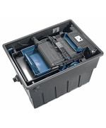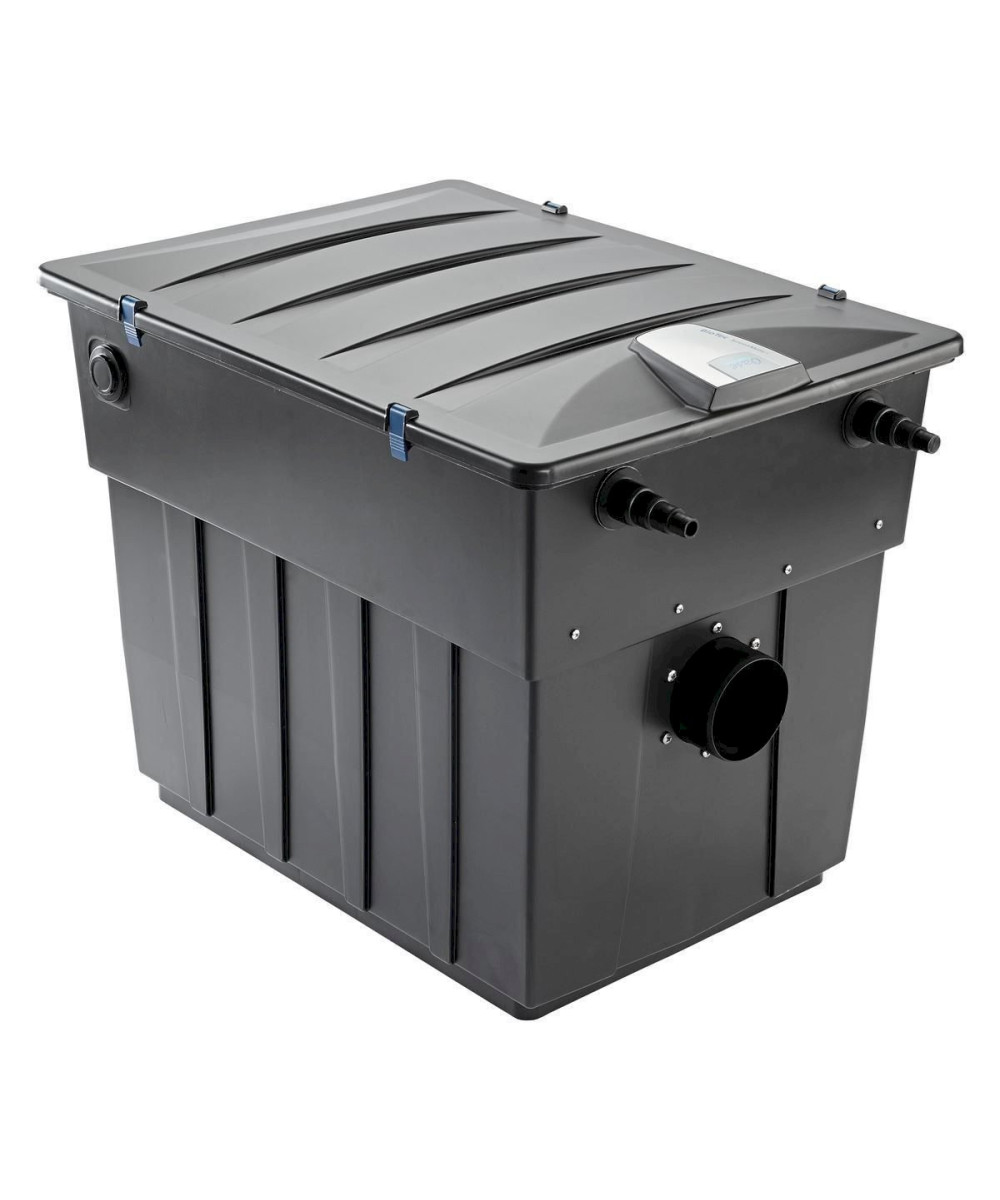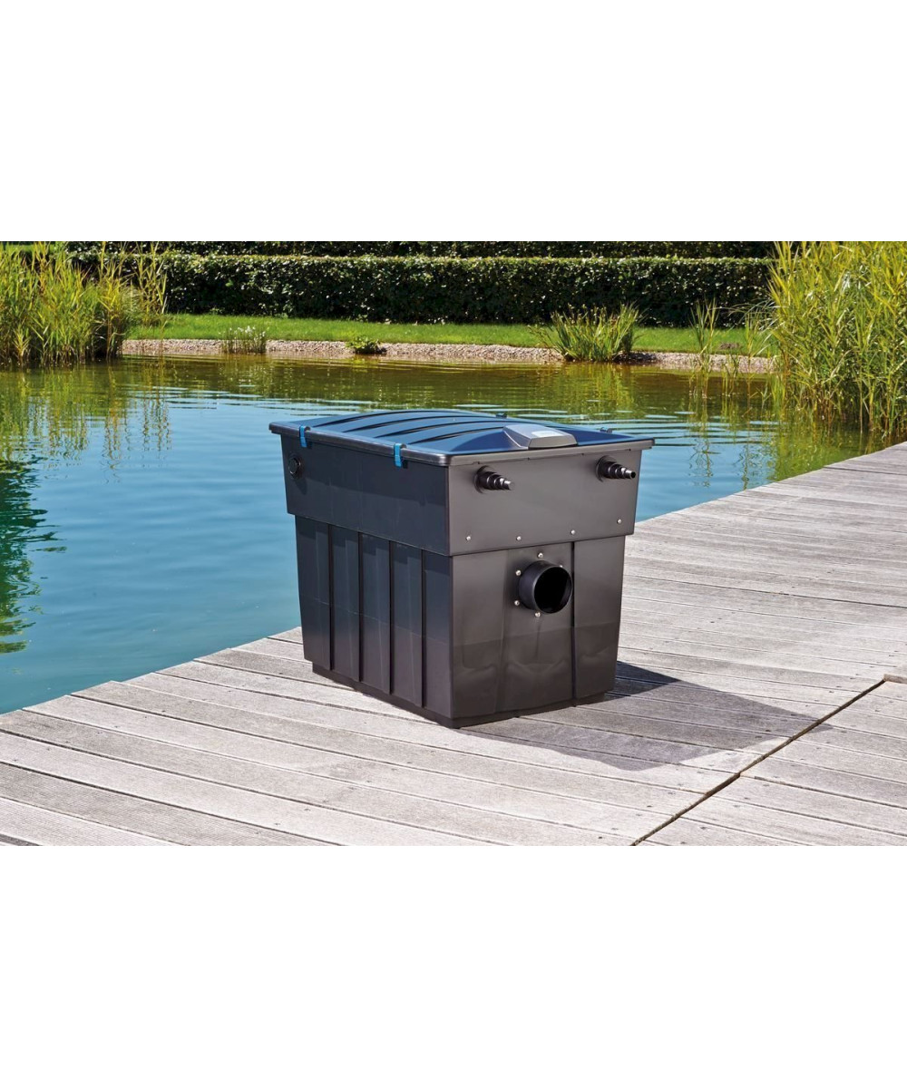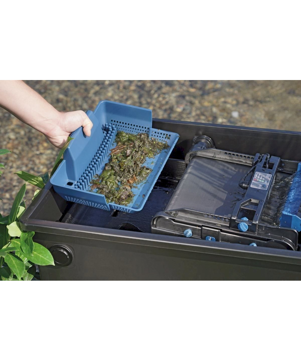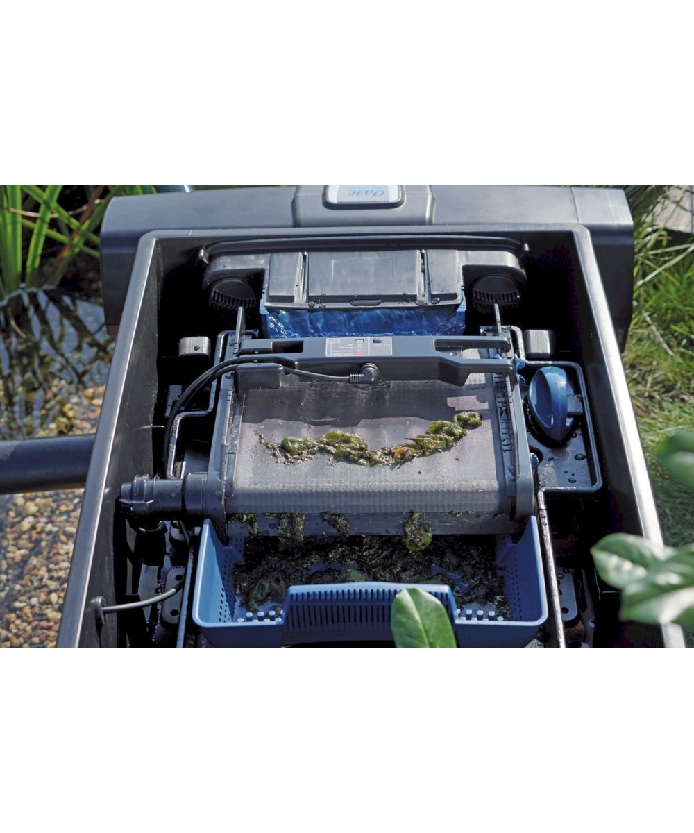 La pompe pour filtres et ruisseaux incluse permet de pomper l’eau sale du fond du bassin vers le filtre gravitaire. Le système est muni d’un mécanisme de nettoyage automatique du tapis filtrant commandé par capteurs intégrés. Ces capteurs détectent le degré d'encrassement et activent le défilement du tapis filtrant de manière entièrement automatique. Pour ce modèle de filtre, il a été opté pour une nouvelle disposition et une meilleure qualité des mousses filtrantes ainsi qu’une meilleure distribution de l’eau sur le tapis filtrant, ce qui permet de prolonger la durée de vie du filtre. La séparation des particules grossières se fait désormais automatiquement en amont de l'entrée du filtre. Le système est équipé d’un épurateur UVC pour une suppression efficace des algues flottantes et des germes présents dans l’eau du bassin.