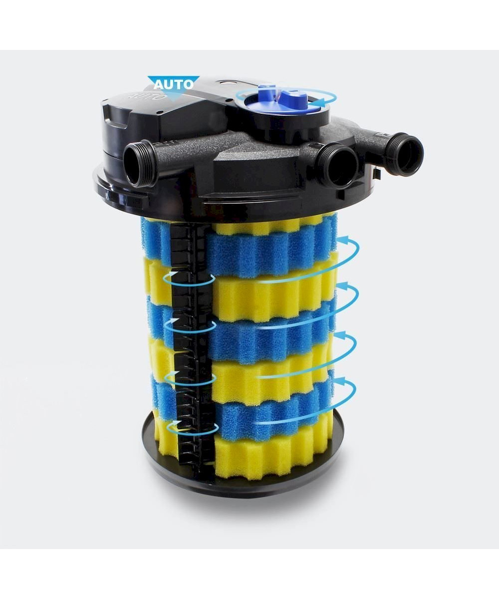 Le filtre à pression biologique est muni d’un système de nettoyage moderne et sophistiqué, qui se règle grâce à un interrupteur à deux fonctions.