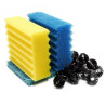 Le principe de fonctionnement de système de filtre biologique de bassin consiste à ce que l’eau de bassin soit pressée très doucement à l’aide de la pompe et du tuyau adéquat, les deux derniers inclus à la livraison. En premier, les éponges filtrent mécaniquement la surface de l’eau des particules en suspension grossières. Lorsque l’eau réside dans les matériaux filtrants, les microorganismes se rassemblent progressivement pour finalement éliminer les germes et les bactéries de l’eau. Le tapis japonais est composé de mono filaments à base de polyester. Sa grande surface favorise aussi la colonisation de bactéries.