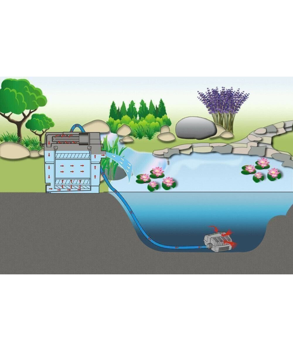 Le filtre de bassin biologique CPF 50000 veille à préserver un équilibre biologique dans les grands bassins et améliore considérablement la qualité de l’eau, et ce sans substances chimiques. Ce système se distingue par sa capacité à clarifier l’eau pour des bassins sans poissons d’une taille allant jusqu’à 8 000 l et allant jusqu’à 4 000 l avec poissons. Le système de filtration doit être mis en service pendant 24 h afin d’assurer un climat sain, une végétation luxuriante et le bien être des poissons.