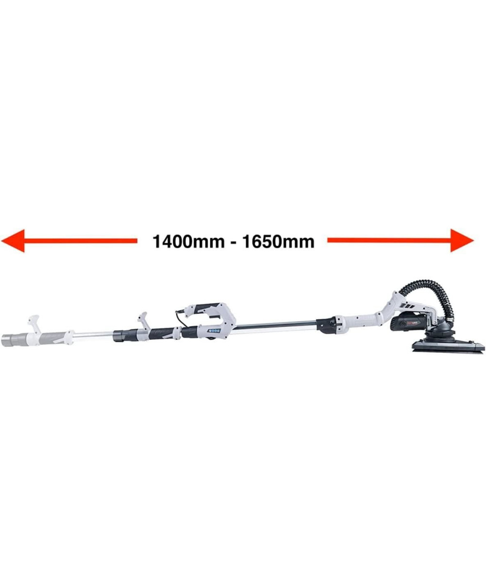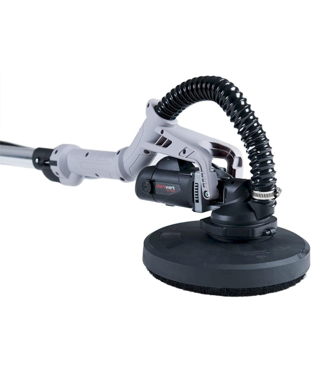 Niveaux de qualité Q1 - Q4. Le ponçage dans les 4 niveaux de qualité est possible avec cette ponceuse de plafond. Avec la ponceuse de plafond, poncez vos murs et plafonds dans les cloisons sèches comme un professionnel. Vous pouvez alors investir dans d'autres domaines sur votre chantier. Résultats de ponçage propres grâce au réglage de la vitesse. Avec la vitesse de rotation adaptée à votre surface, vous obtenez toujours un résultat de ponçage propre. Ponceuse triangulaire pour des résultats de ponçage propres dans les coins. Grâce au système de tête amovible et à la fonction télescopique, vous pouvez monter rapidement la ponceuse triangulaire et poncer vos coins proprement. Parois et plafonds lisses dans les cloisons sèches. Avec cette ponceuse, vous libérez vos murs de presque tous les résidus tels que peinture, plâtre, restes de papier peint, mastic et résidus de colle.