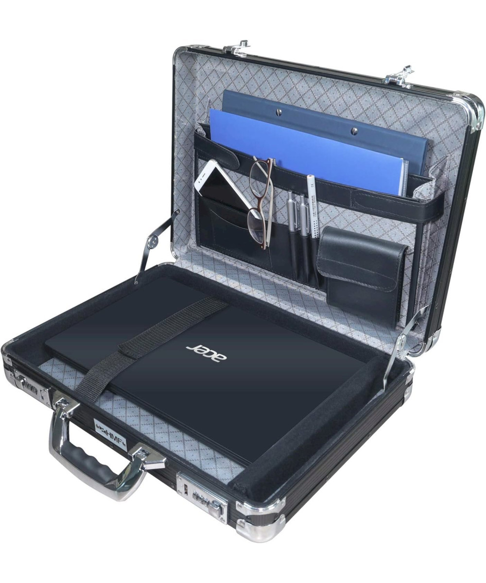 - La mallette a des coins arrondis et un cadre en aluminium renforcé pour une grande stabilité et la meilleure protection pour votre ordinateur portable