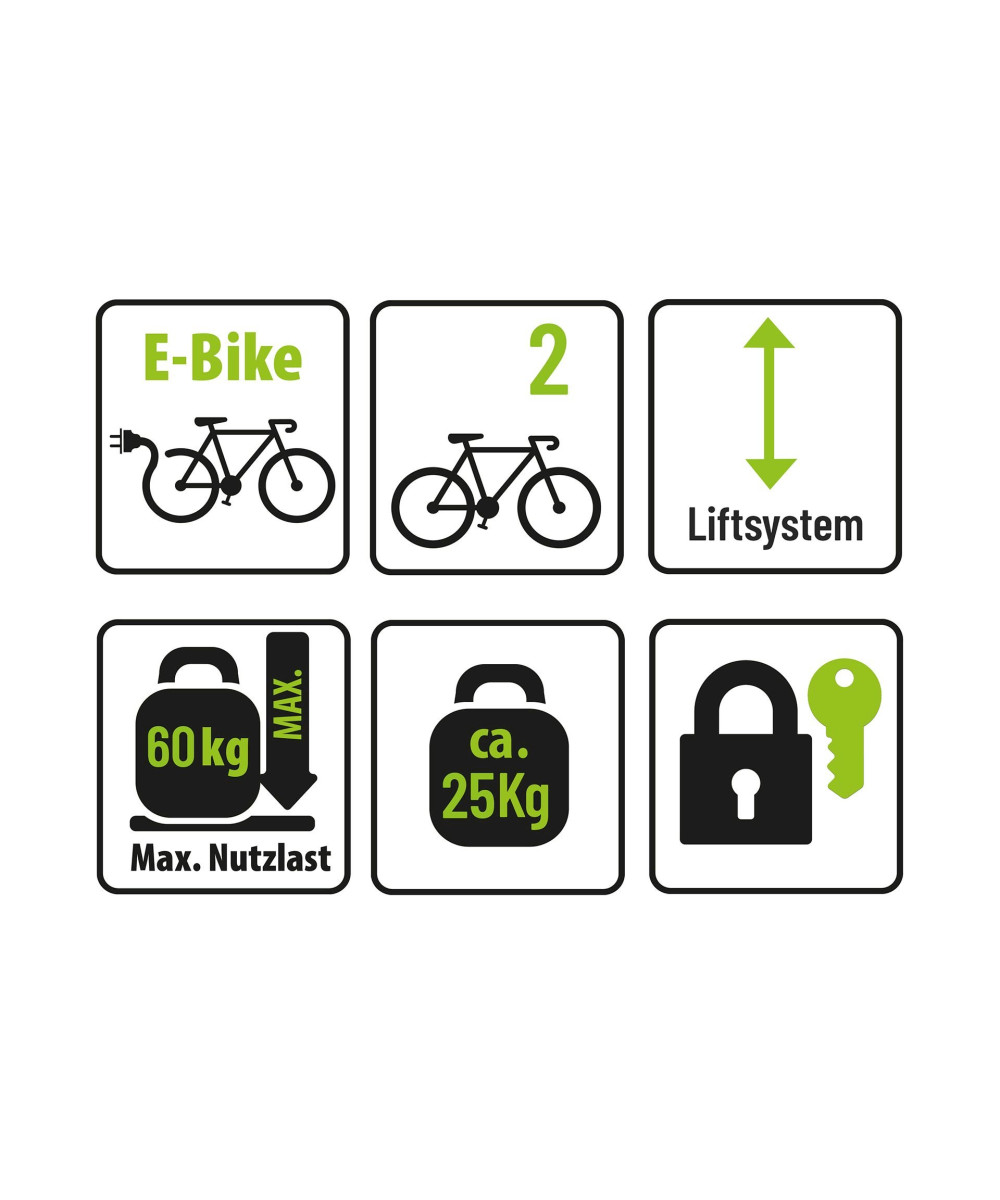 - Befestigung der Fahrräder am U-Bügel: abnehmbare Strap-Rahmenhalter für Rahmendurchmesser von 3 – 10 cm und einem maximalen Umfang von ca. 32,5 cm