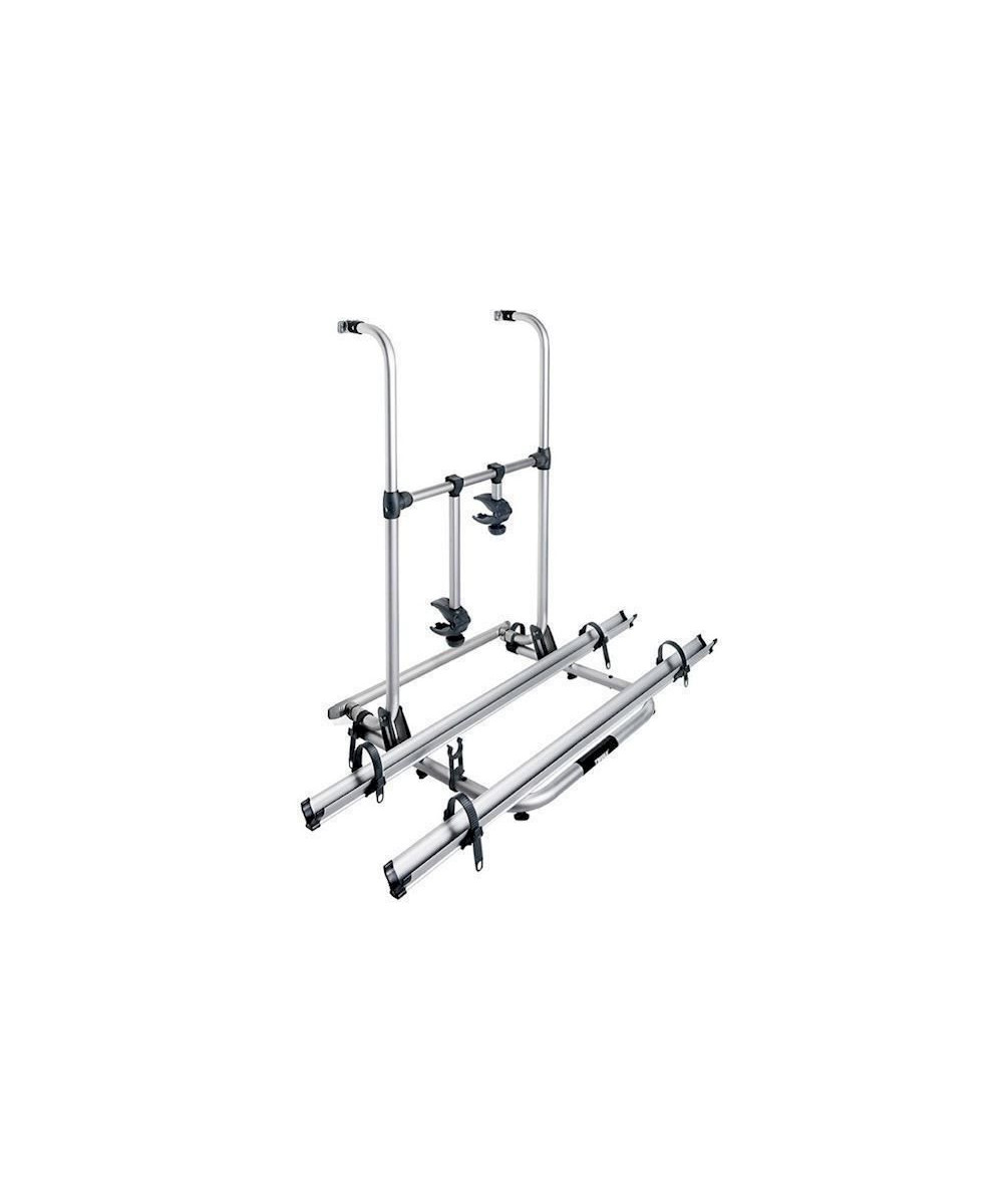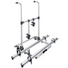 Porte 2 vélos avec cadre en aluminium. Plateforme verrouillable pendant la route. Rails coulissants pour faciliter le placement des vélos. Montage possible sur pattes de fixation Fiamma. Charge max. : 50 kg. Avec 2 rails et 2 Bike Holders. Recommandé pour une paroi de 80 à 150 cm. Poids : 7,6 kg.
