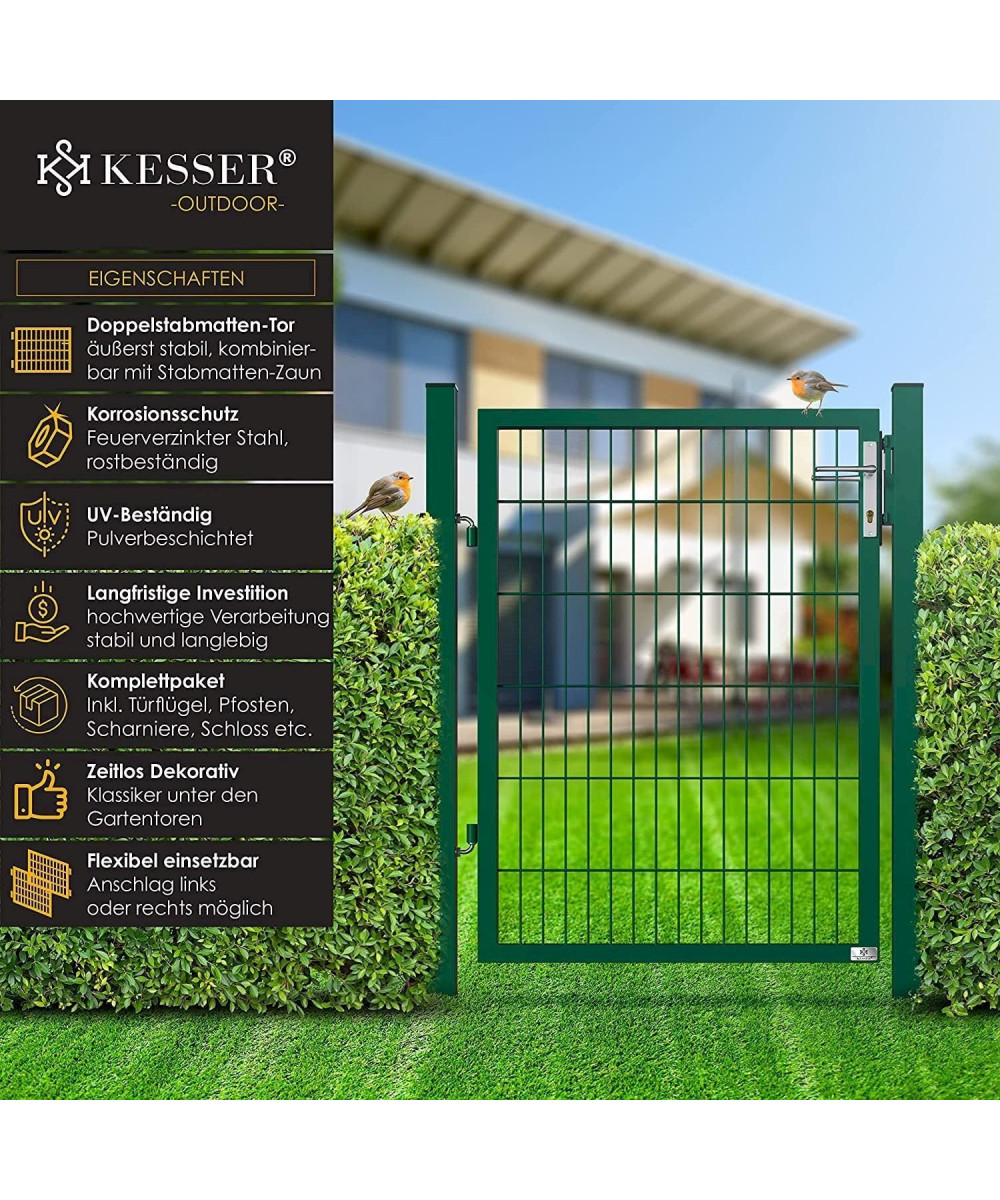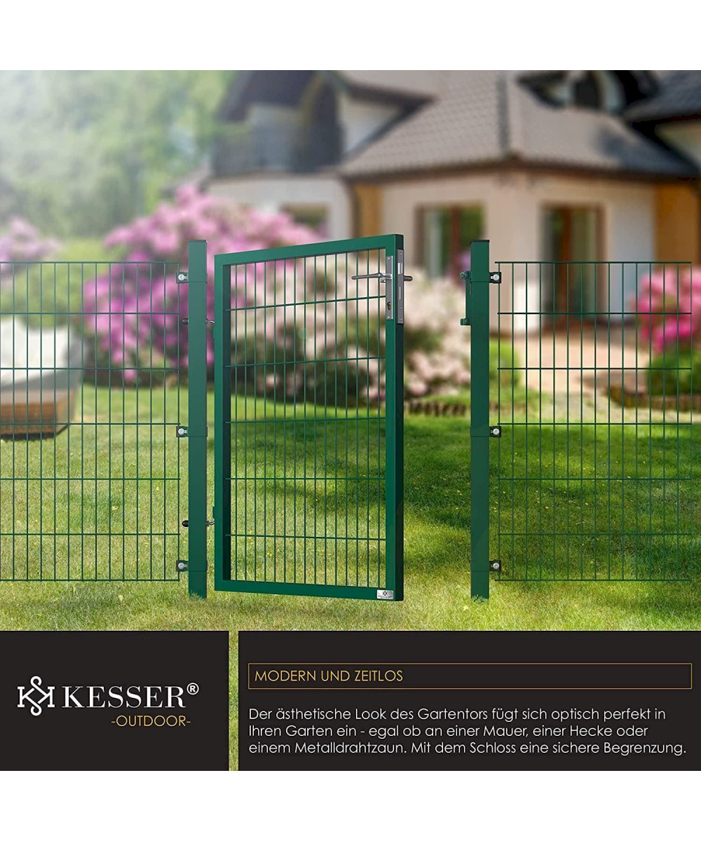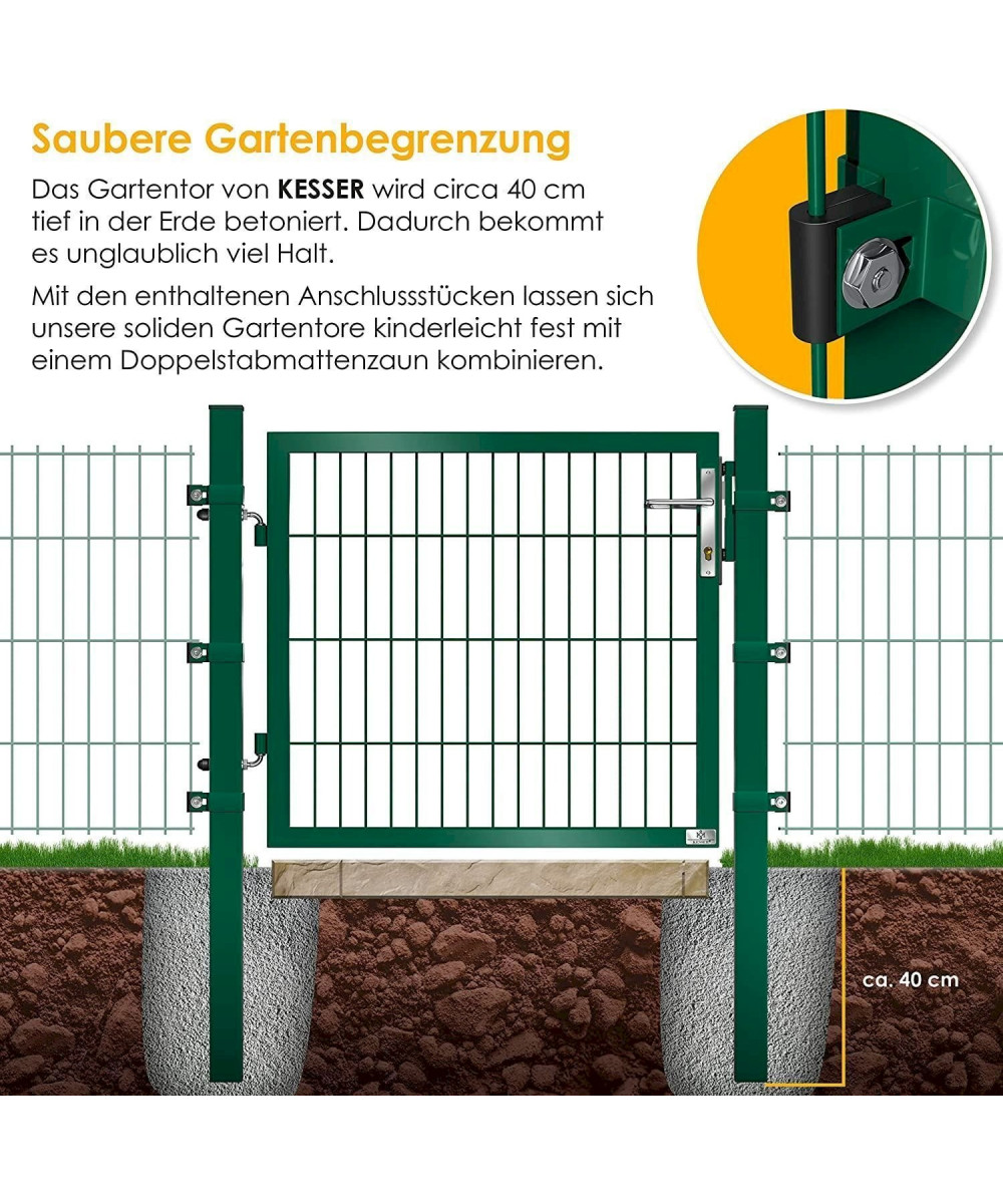 La porte de jardin de Kesser est d'environ 40 cm de profondeur dans la terre. Cela lui confère une tenue incroyable et avec les raccords inclus dans la livraison, nos portes solides peuvent être combinées facilement et fermement avec une clôture à double fil. La grille soudée par points a une construction sophistiquée avec une maillage de 200 x 50 mm. Selon vos besoins, vous pouvez monter la butée de la porte en acier à gauche ou à droite. Pour encore plus de flexibilité, le portail s'ouvre dans les deux sens.