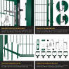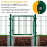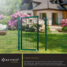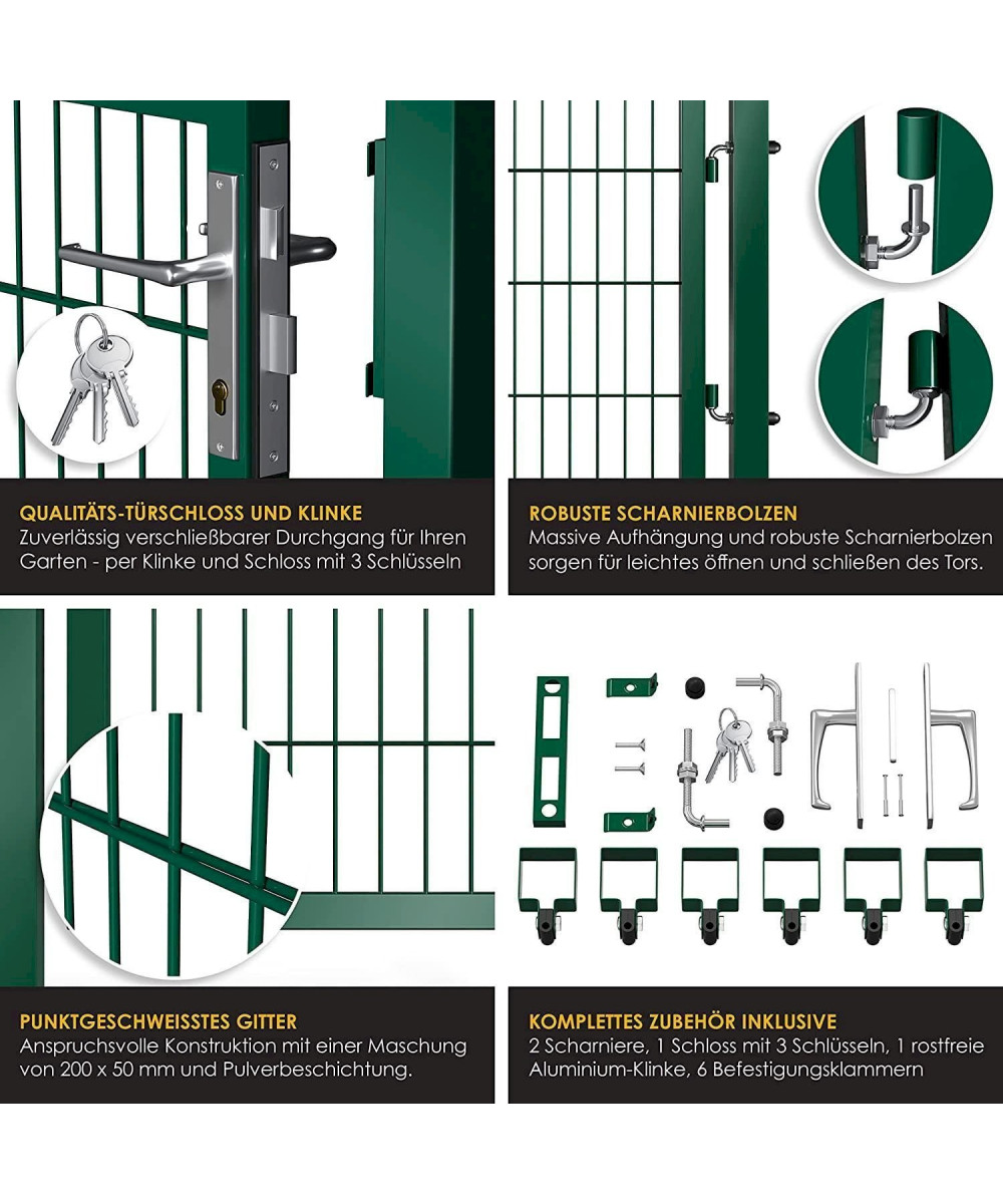 Sans soucis avec ce kit complet – pour un montage facile, les accessoires nécessaires sont inclus dans la livraison. Les accessoires comprennent deux boulons de charnière robustes qui sont responsables d'une ouverture et d'une fermeture faciles. Un cadenas avec trois clés et un jack inoxydable pour votre sécurité. En outre, six clips de fixation pour la connexion à une clôture à double barre.