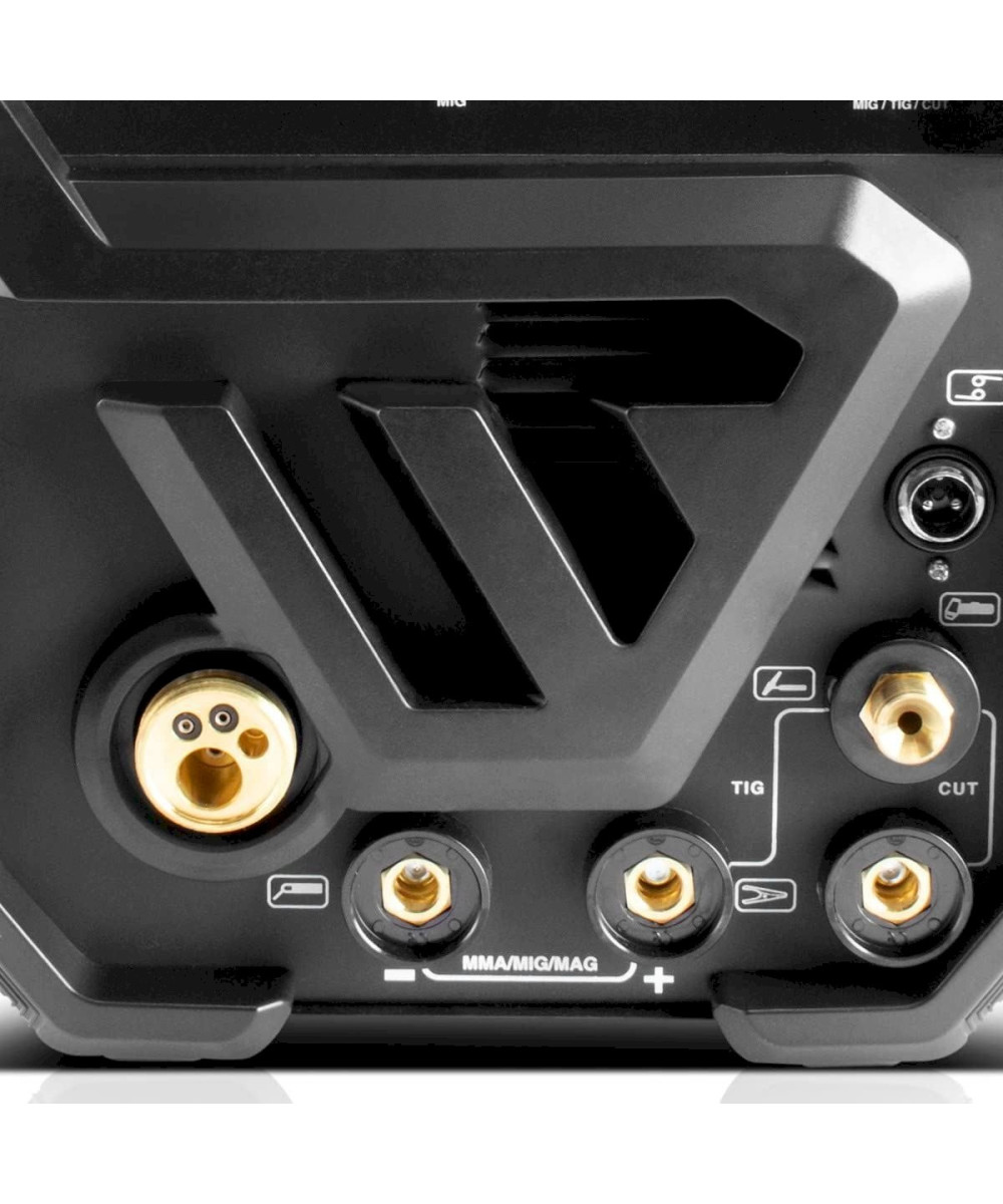 - Efficacité et puissance maximales - le courant alternatif monophasé (230 V) alimente l'unité et permet une puissance de sortie de 200 ampères réels pour le TIG + MIG/MAG + MMA.