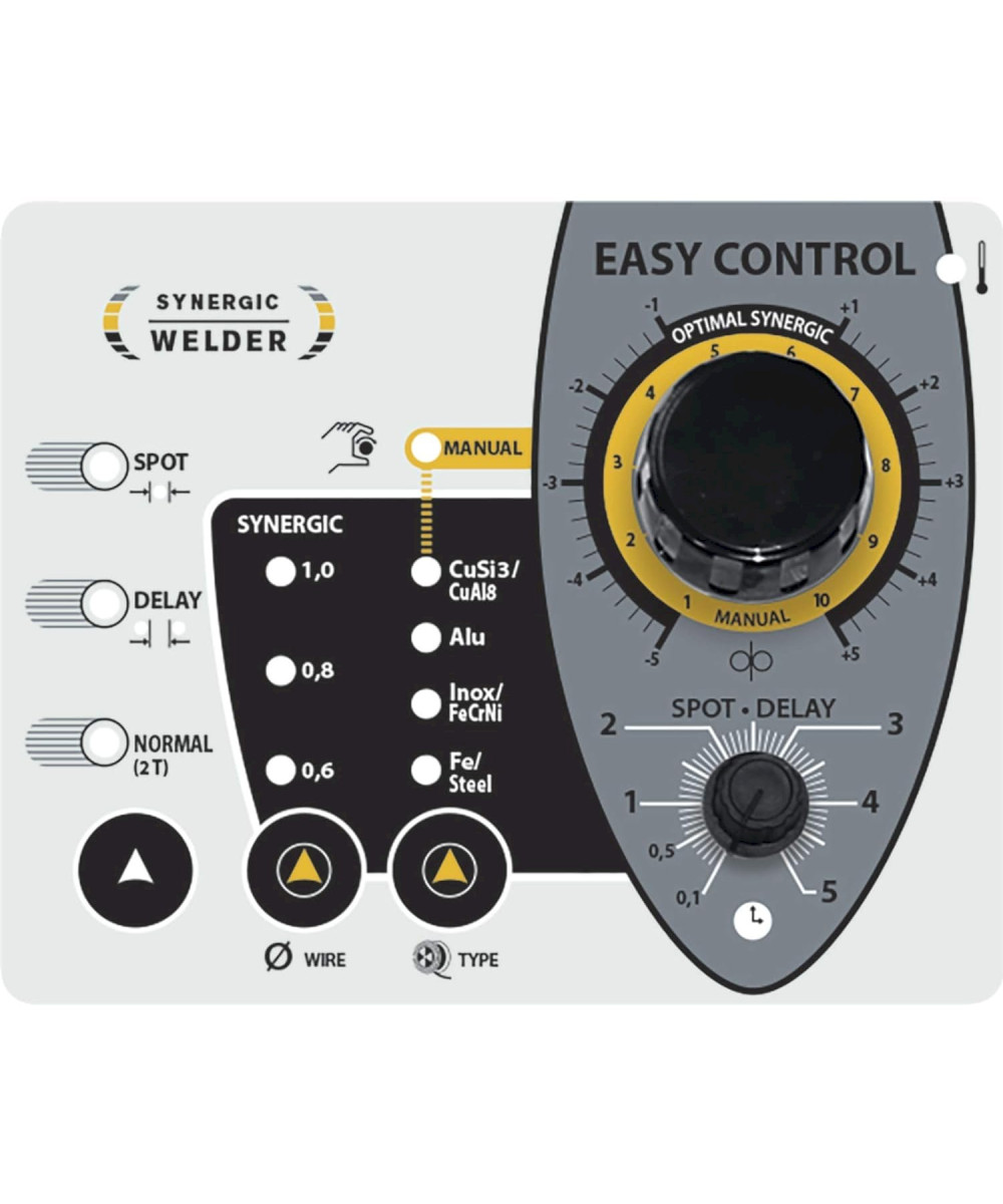 Poste de soudage MIG/MAG, 30-200 A, commande par microprocesseur semi-synergétique. Idéal pour les travaux de serrurerie et d'entretien. Utilisation simple. Optimise la vitesse d'insertion du fil de soudure en fonction de la puissance de soudage sélectionnée. Fonction Wire Burn Back préréglée Fonctions SPOT et DELAY régulables. SPOT : soudage par point et durée de soudage réglable. Fonction "Pause" (Soudage par points avec pause réglable entre deux points de soudure). Fonctionne sur des groupes électrogènes.