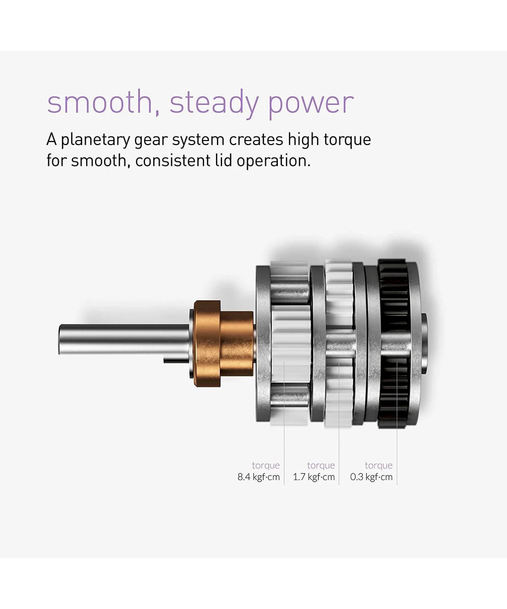 Un système d'engrenage planétaire offre un couple puissant qui assure une ouverture-fermeture du couvercle douce et homogène. - propre et facile