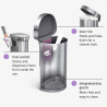 Le poubelle demi-lune à capteur sans contact s'ouvre automatiquement d'un simple geste de la main, pour que l'élimination de vos déchets soit aussi rapide que simple et efficace. Elle possède un détecteur de mouvement à champ infrarouge qui détecte la zone située au-dessus de la poubelle, afin que celle-ci s'ouvre automatiquement. Le rebord se soulève pour un accès facile au sac, puis se referme pour le maintenir et le dissimuler complètement. Une couche transparente de nano-argent protège l'acier inoxydable des traces de doigts et des microbes.