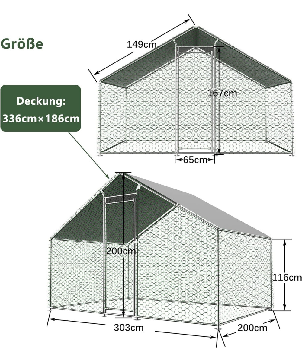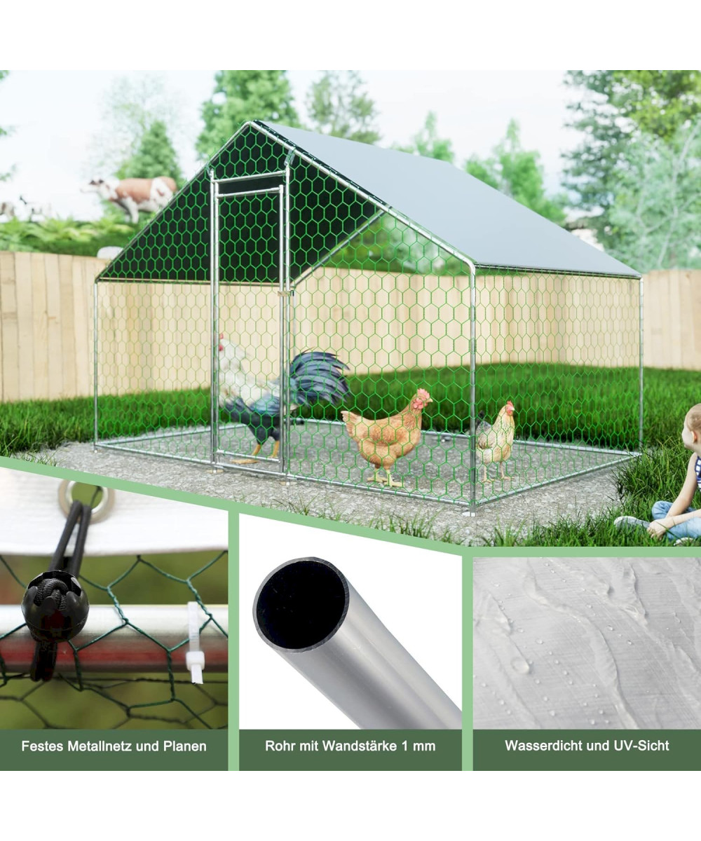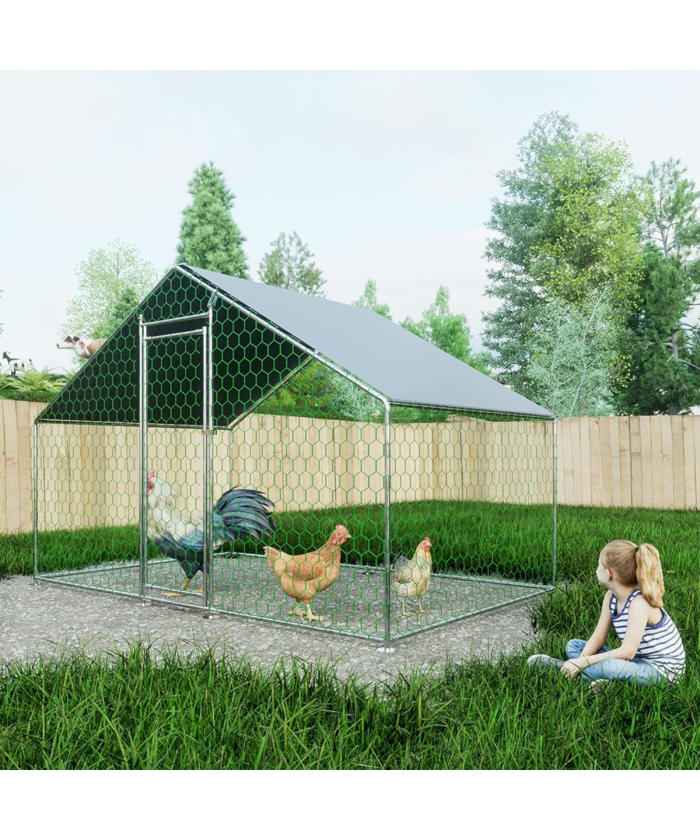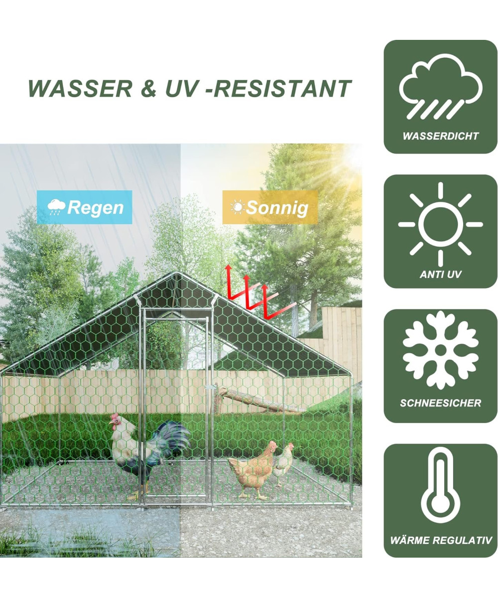 Ce poulailler est fabriqué en acier galvanisé de haute qualité pour plus de solidité et de durabilité. Il dispose d'un toit 100 % polyéthylène résistant à l'eau et aux rayons UV, et protège du soleil, de la pluie, de la neige et d'autres intempéries.