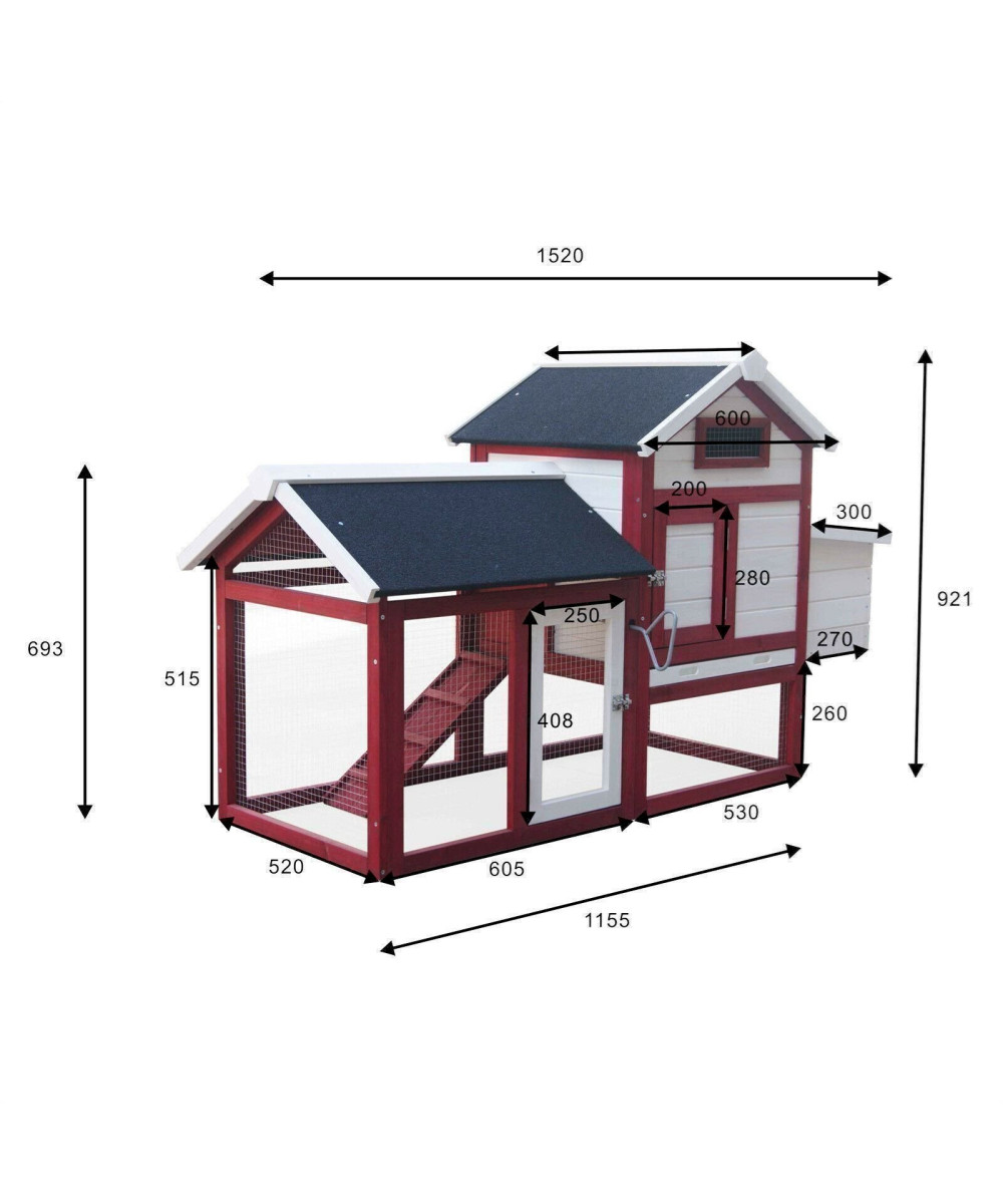 Le châssis est en bois de sapin, peint en rouge et blanc, ce qui confère au poulailler une touche chaleureuse. Le grillage qui entoure la structure en bois, est en matériau galvanisé, facile à nettoyer, résistant aux intempéries et qui permet une bonne circulation de l’air. Le toit est isolé au bitume, protégeant les animaux de la pluie.