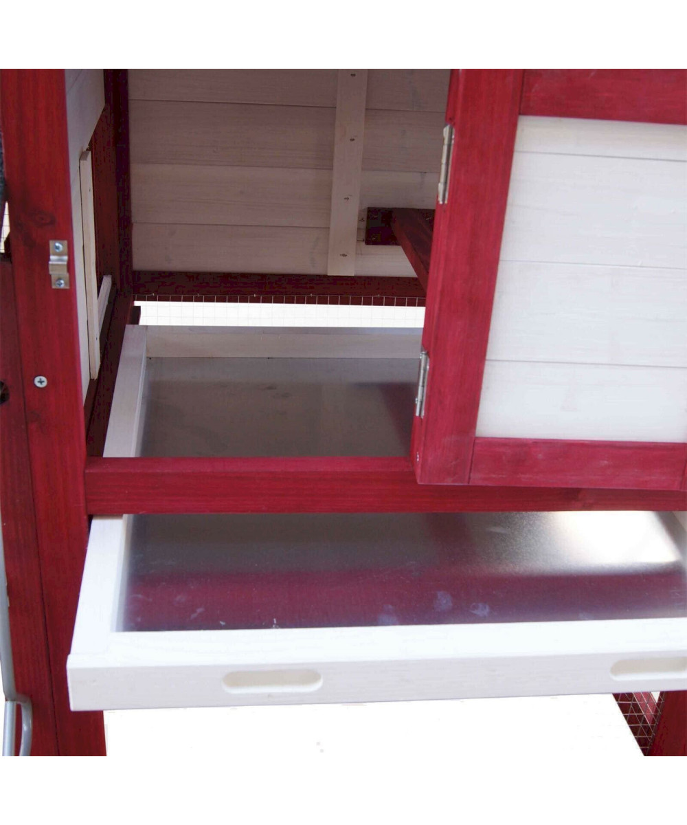 Vous avez de la place dans votre jardin et vous désirez un réveil au chant des coqs, des œufs frais au petit déjeuner ? C’est possible, mais non sans une certaine organisation pour accueillir vos volailles. Un poulailler est indispensable pour plusieurs raisons. Il sert, entre autres, d’abri contre les intempéries et les prédateurs. Nous vous offrons un poulailler comprenant un nichoir et un enclos extérieur, pour offrir à votre volaille le confort nécessaire à leur bien-être. Nous le savons tous, seules des poules heureuses donnent des œufs sains. Avec des dimensions extérieures de 152 x 52 x 92 cm (l x p x h), le poulailler est de taille généreuse et de conception ingénieuse, au vu de la diversité de son architecture. La nuit, par exemple, les poules peuvent se retirer dans la maisonnette située à l’étage supérieur. Par ailleurs, l’aspect hygiénique a été pris en compte, surtout au niveau facilité et rapidité. Le plancher est amovible. Un plateau galvanisé est encastré dans ce plancher, qui à son tour, se nettoie et se désinfecte. Très vite, le plancher redevient fonctionnel.