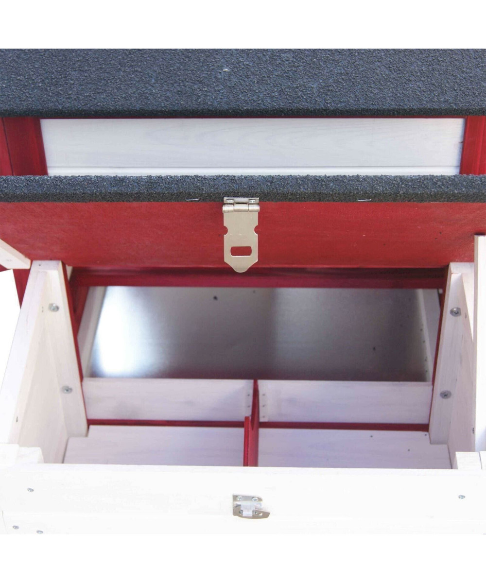 À côté de la maison, se trouve un nichoir en forme de cabane à l’étage supérieur, avec une surface de 270 x 520 cm, et qui se situe à l'extrémité de la construction, un peu en retrait, étant donné que c'est là que les poules peuvent se retirer pour couver en toute tranquillité. Pour un meilleur contrôle de la couvaison ou pour retirer les œufs frais, vous pouvez le faire aussi avec les deux mains libres ; il suffit d’ouvrir le clapet, qui n'est autre que le toit à charnières. Si nécessaire, vous pouvez fixer le toit à l’aide d’un support intégré, afin de le garder en position ouverte.