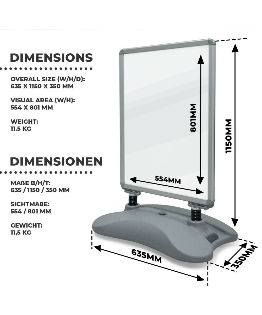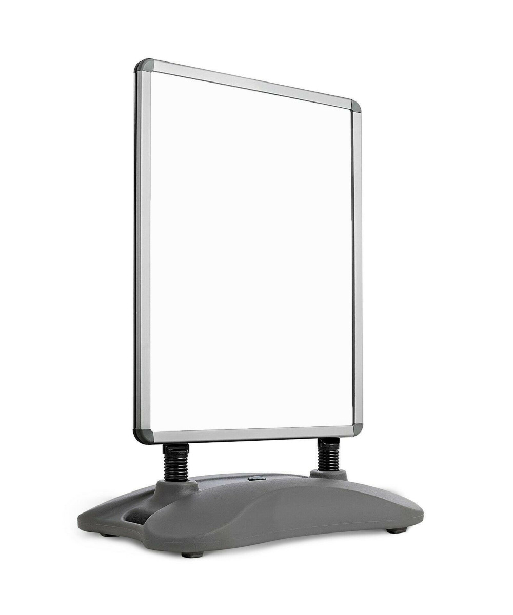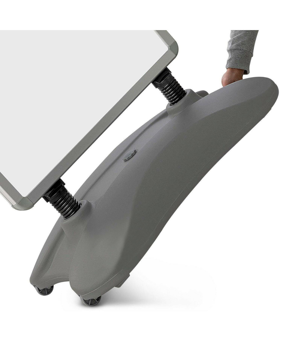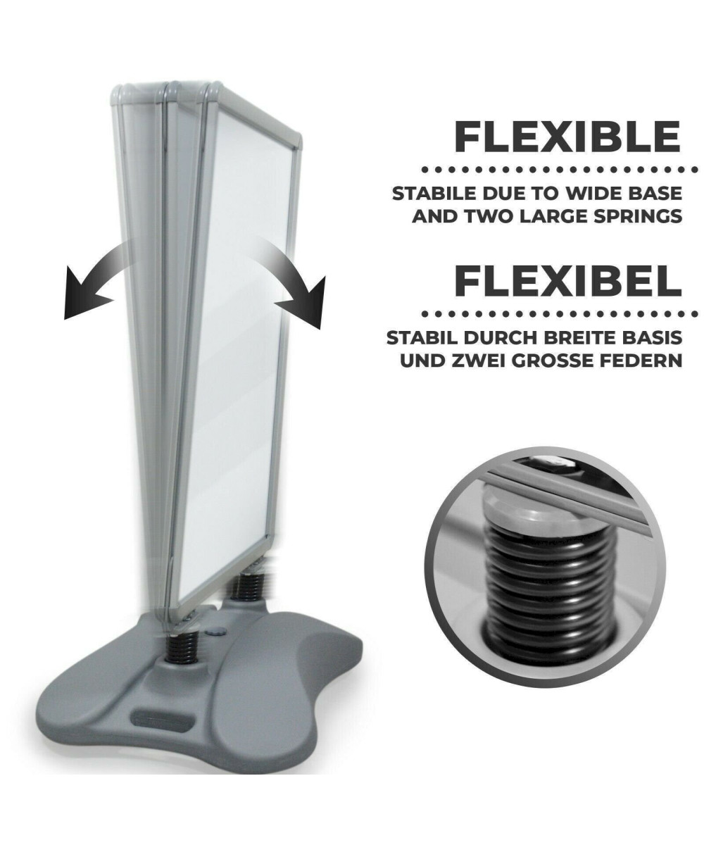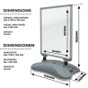 Ce panneau d'affichage avec double face transmettra sans aucun doute avec succès un message publicitaire précis. Sa base peut être remplie avec de l'eau ou du sable et facilement déplacée grâce à ses roulettes latérales et sa poignée ergonomique. Le film de protection résistant aux conditions climatiques défavorables, le cadre en aluminium et la base en plastique robuste permettent de l'utiliser à l'intérieur comme à l'extérieur.