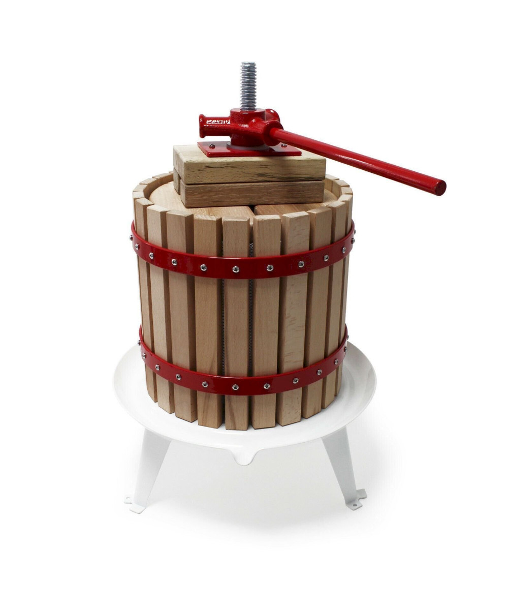 Un pressoir de baies solide avec un rendement de jus idéal et une très haute pression de pressage grâce à la construction de la tige métallique. Contrairement aux pressoirs des autres fournisseurs, le panier est en bois d’hêtre (rouge) solide .