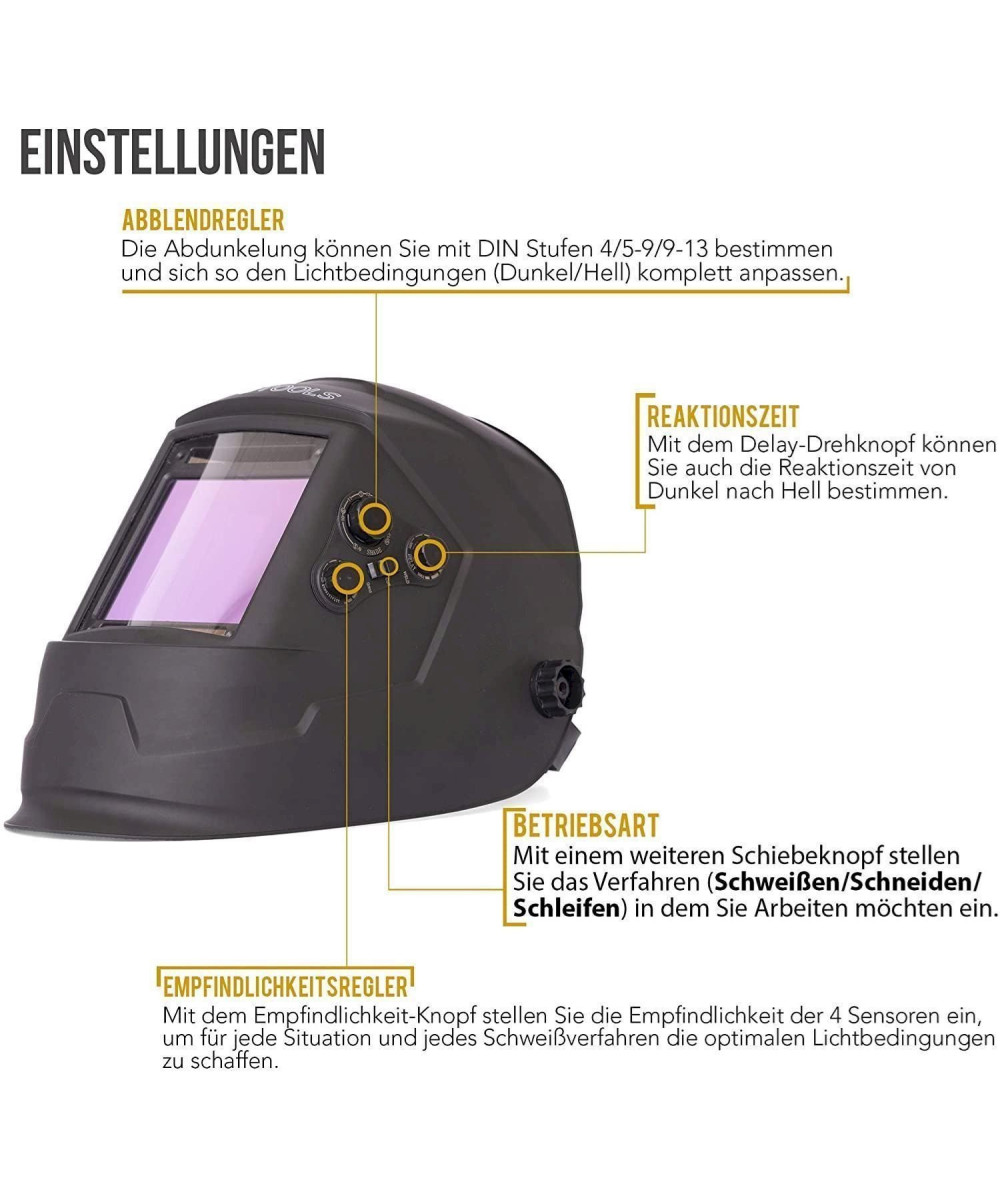 Les 4 capteurs de haute qualité assurent un obscurcissement extrêmement rapide et fiable. Ainsi, vous n'aurez plus à soulever et à baisser le masque car le filtre s'assombrit automatiquement lorsque l'arc apparaît et s'éteint à nouveau lorsqu'il est éteint. Vous pouvez vous concentrer pleinement sur votre travail, car les deux mains sont libres et vous n'avez plus à vous soucier de la décoloration.
