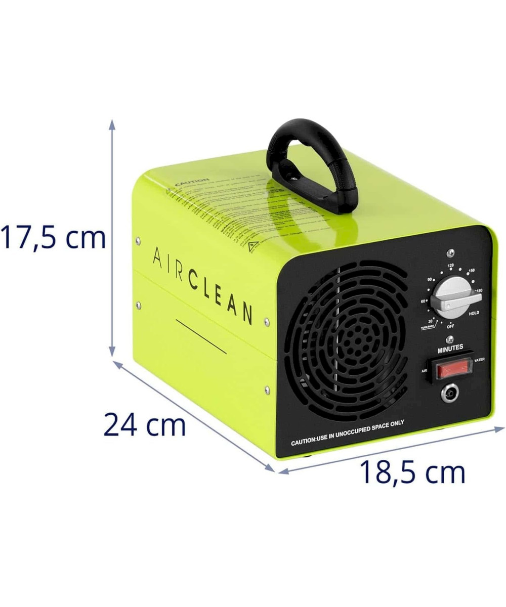 Cet ozoneur possède un boitier compact et ultrarobuste en acier revêtu. Il est aussi muni d’une poignée afin de garantir un transport confortable. Ses pieds en caoutchouc lui procurent une excellente stabilité et protègent les surfaces contre les rayures où qu’on le pose.